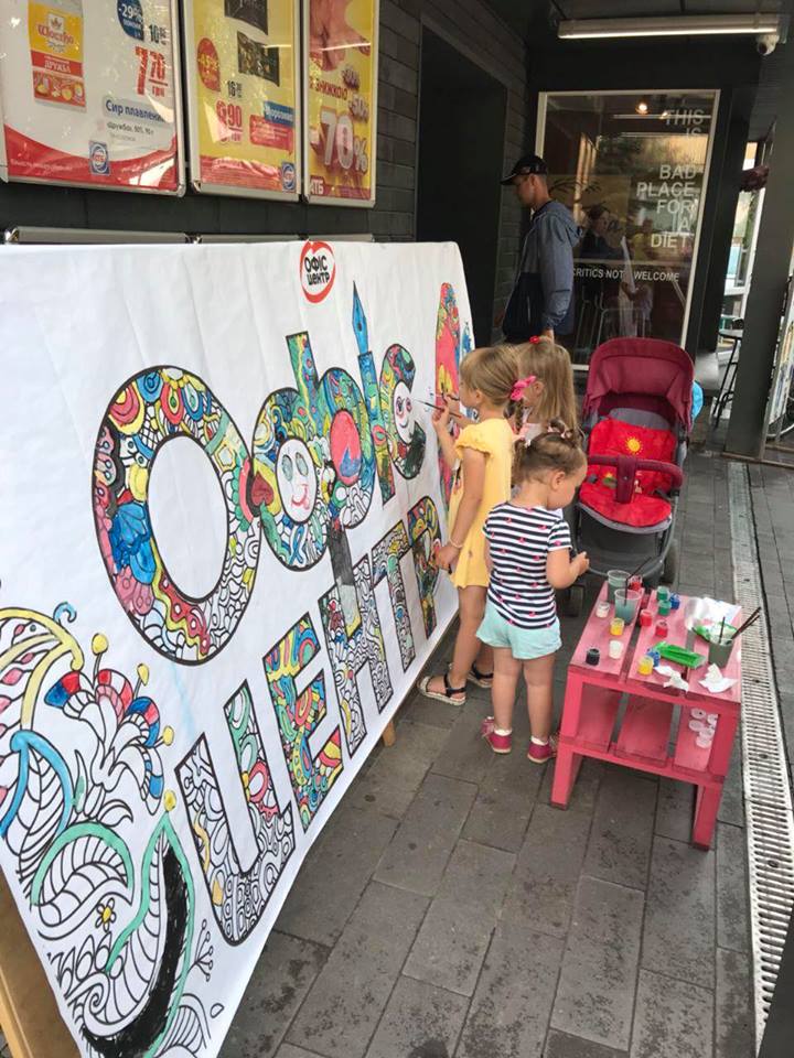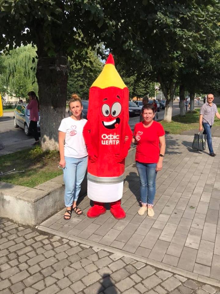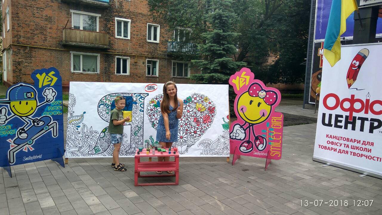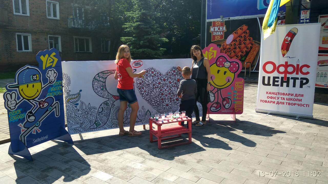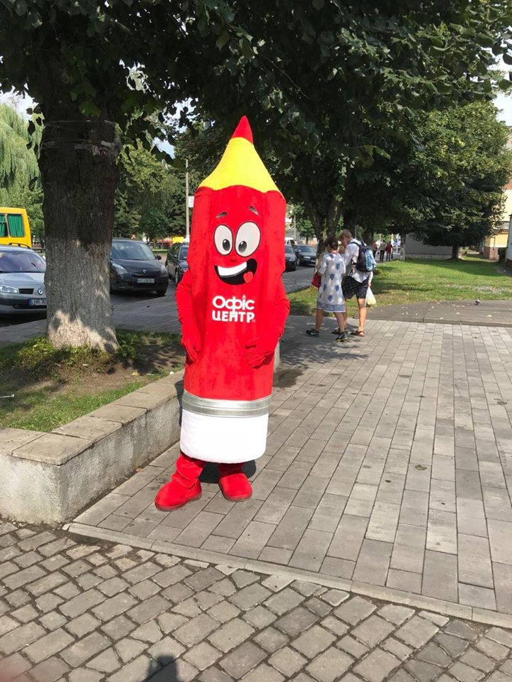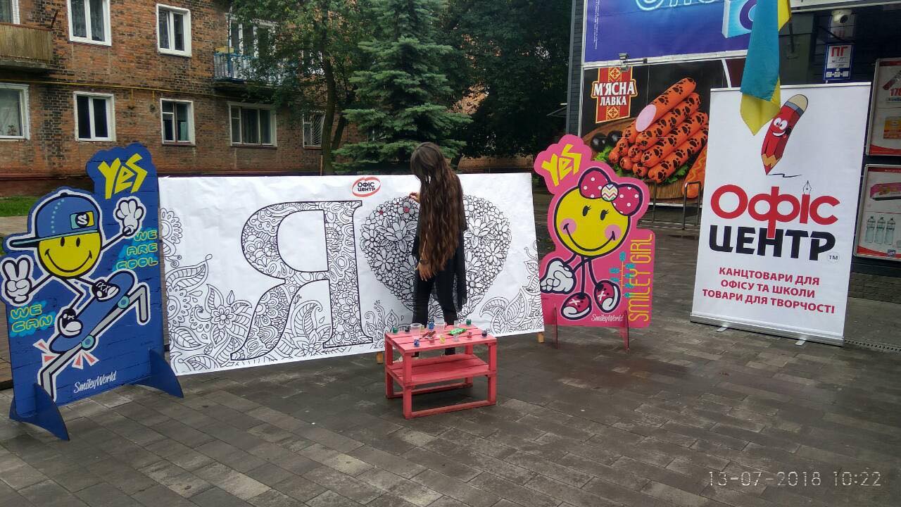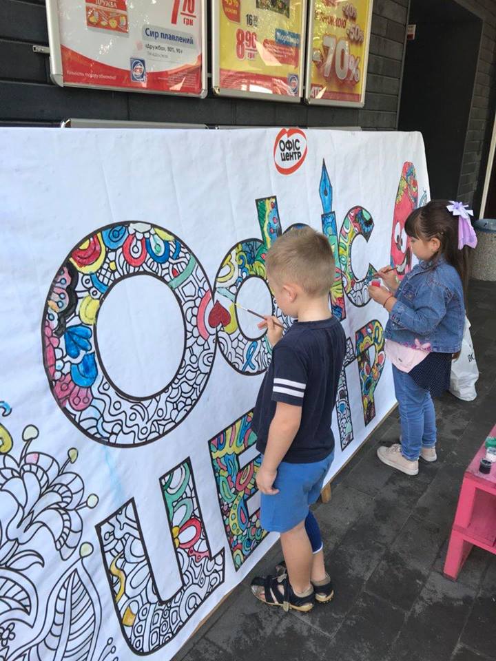 На вулиці нікого байдужим не залишила двометрова розмальовка-антистрес, повз яку навіть дорослі не могли пройти. На шопінг запрошував веселун Олівець, символ мережі «Офіс-центр».