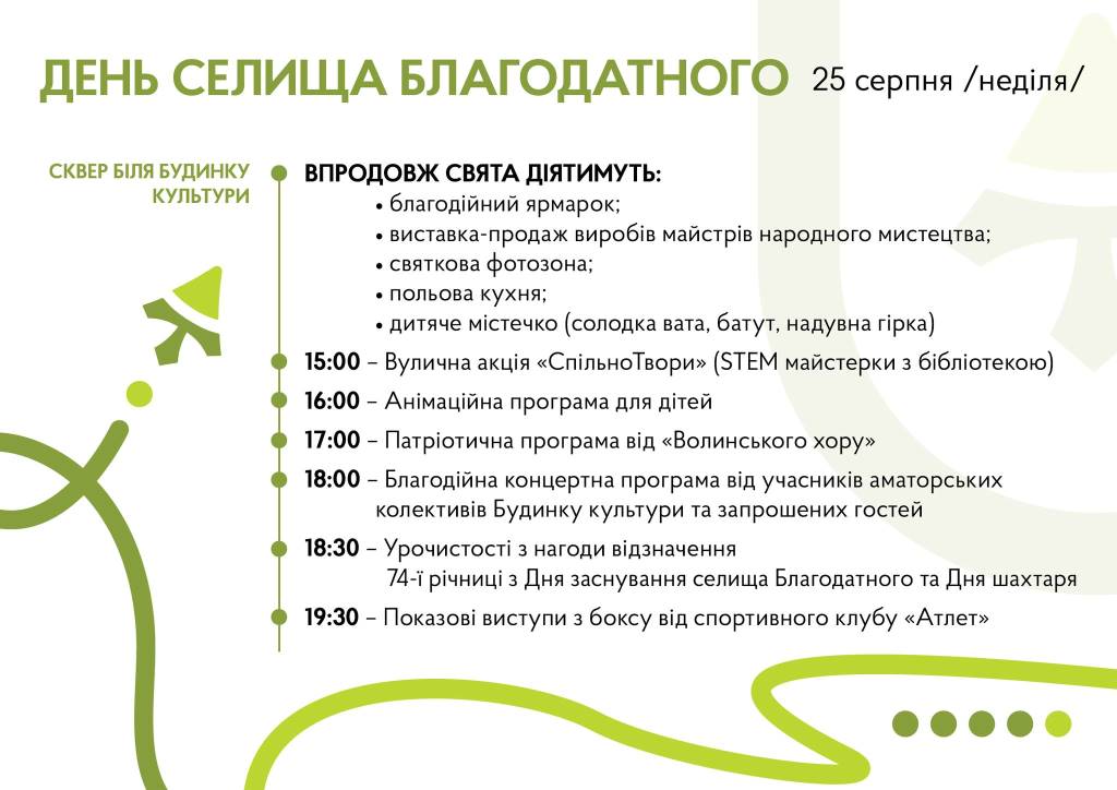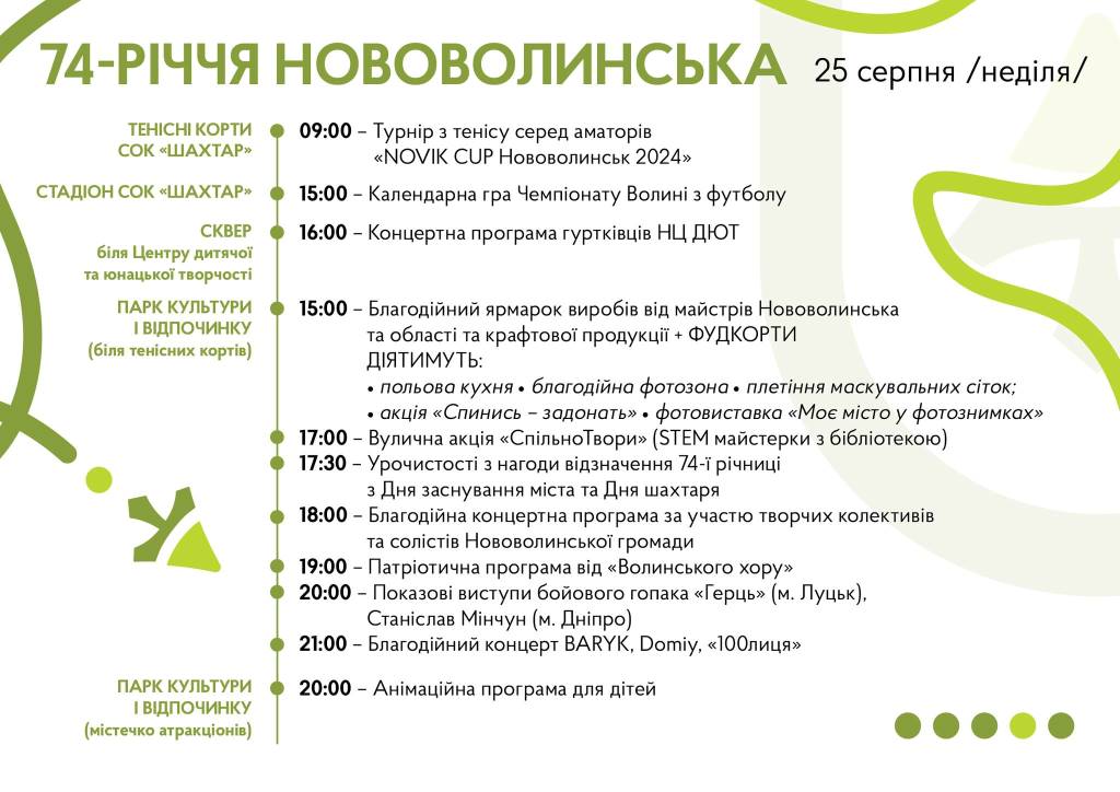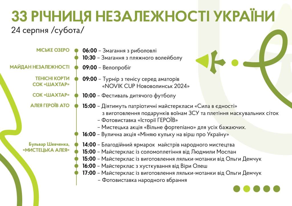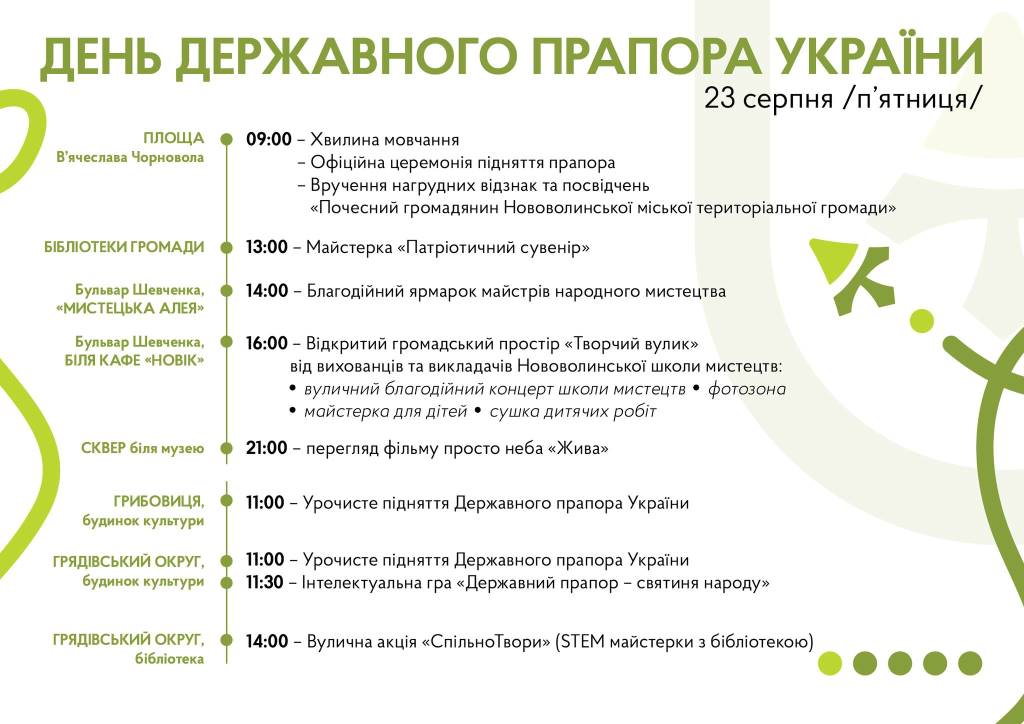 Цього тижня, з 23 по 25 серпня, Нововолинська громада відзначатиме кілька знакових подій. Відбудуться заходи з нагоди Дня Державного Прапора, Дня Незалежності України та Днів міста Нововолинська й селища Благодатного.