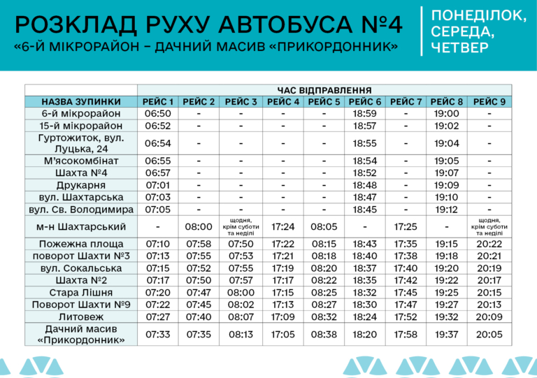 «З 17 квітня (понеділок) починає курсувати пільговий автобус № 4 за маршрутом «6-й мікрорайон – дачний масив «Прикордонник».