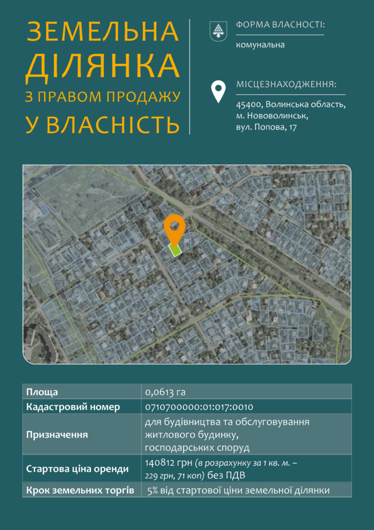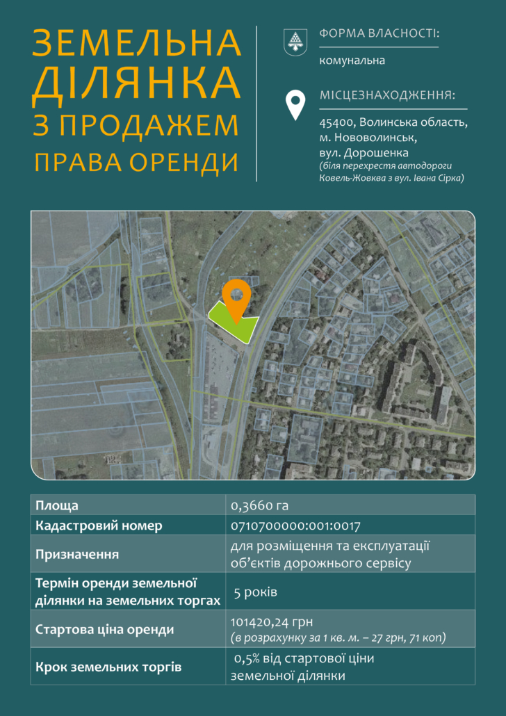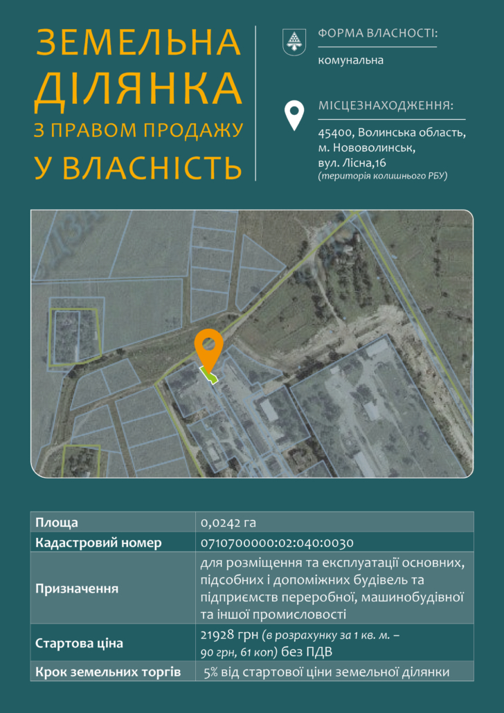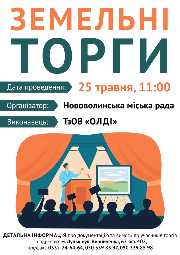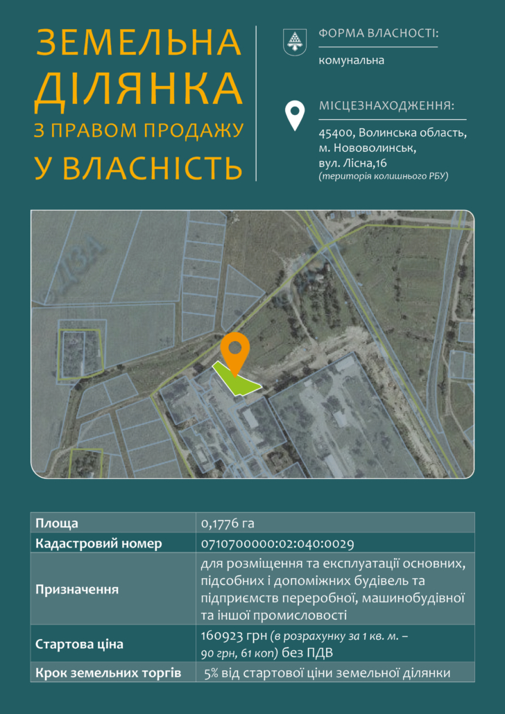 25 травня об 11:00 відбудуться торги у формі аукціону з продажу права оренди та права продажу у власність земельних ділянок у Нововолинську.