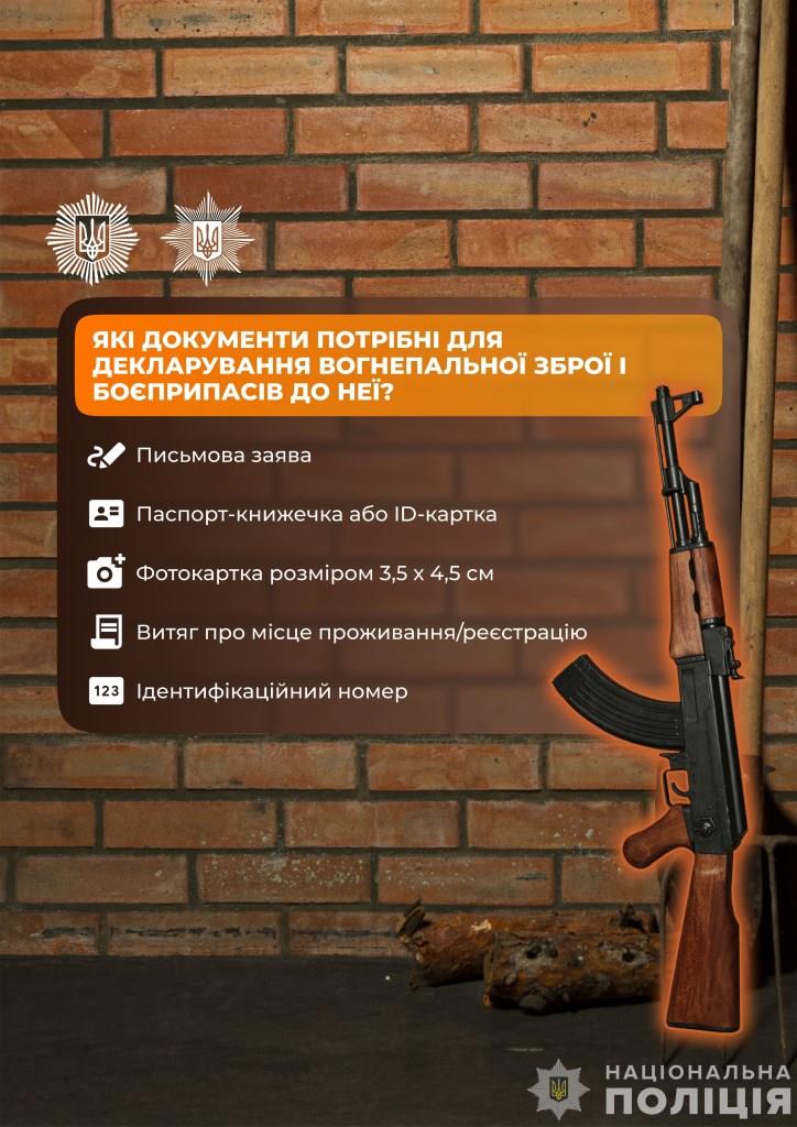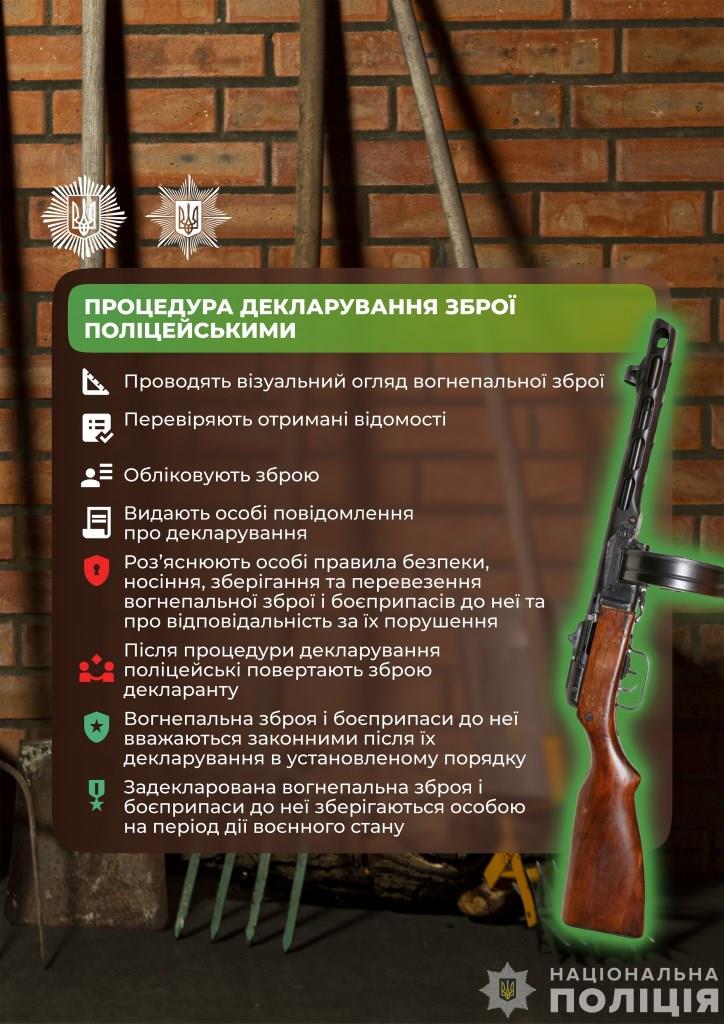 Очільник сектору контролю за обігом зброї Олег Печінка розповів про процедуру декларування зброї. Спершу поліцейські проводять візуальний огляд вогнепальної зброї, перевіряють отримані відомості, далі обліковують зброю, видають особі повідомлення про декларування, роз’яснюють правила безпеки, носіння, зберігання та перевезення вогнепальної зброї і боєприпасів до неї та про відповідальність за їх порушення. Після процедури декларування поліцейські повертають зброю декларанту. Якщо громадянин не хоче залишати у себе зброю, співробітники поліції приймуть її на добровільних засадах.