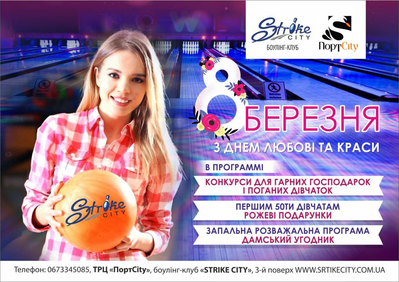 Для любителів активного відпочинку з 7 по 10 березня з 20:00 у “StrikeCity” цікава розважальна програма. Для жінок – спеціальні пропозиції та конкурси. А саме 8-го березня з 20:00 – неймовірне свято з подарунками та розважальною програмою.