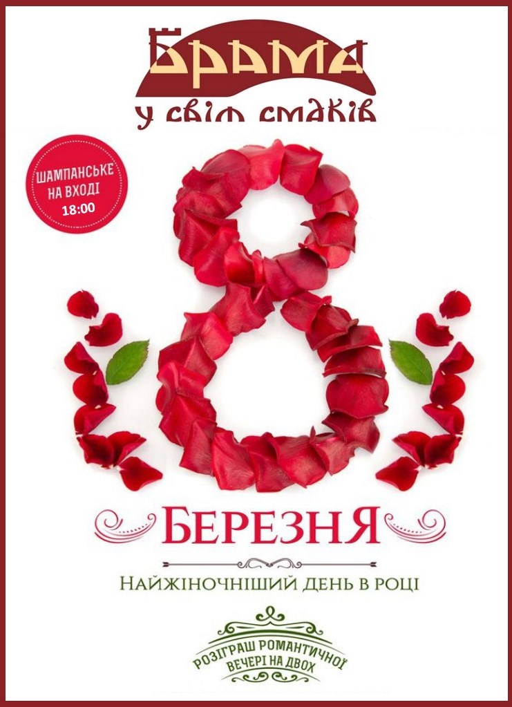Усіх дам ресторація «Брама» безкоштовно пригостять бокалом ігристого та подаруєквіти. Окрім того, гості мають нагоду взяти участь у розіграші. Для цього 8-го та 9-го березня необхідно буде заповнити анкету. Переможців оголосять 10-го березня о 18:00. Щасливці отримають романтичну вечерю на двох. Присутність на розіграші – обов’язкова.
