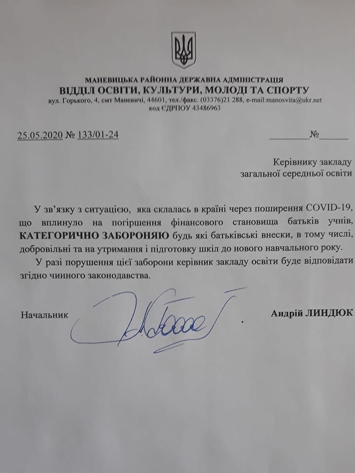 «У зв’язку з ситуацією, яка склалась в країні через поширення COVID-19, що вплинуло на погіршення фінансового становища батьків учнів, категорично забороняю будь-які батьківські внески, в тому числі, добровільні та на утримання і підготовку шкіл до нового навчального року. У разі порушення цієї заборони керівник закладу освіти буде відповідати згідно чинного законодавства», – йдеться у документі.