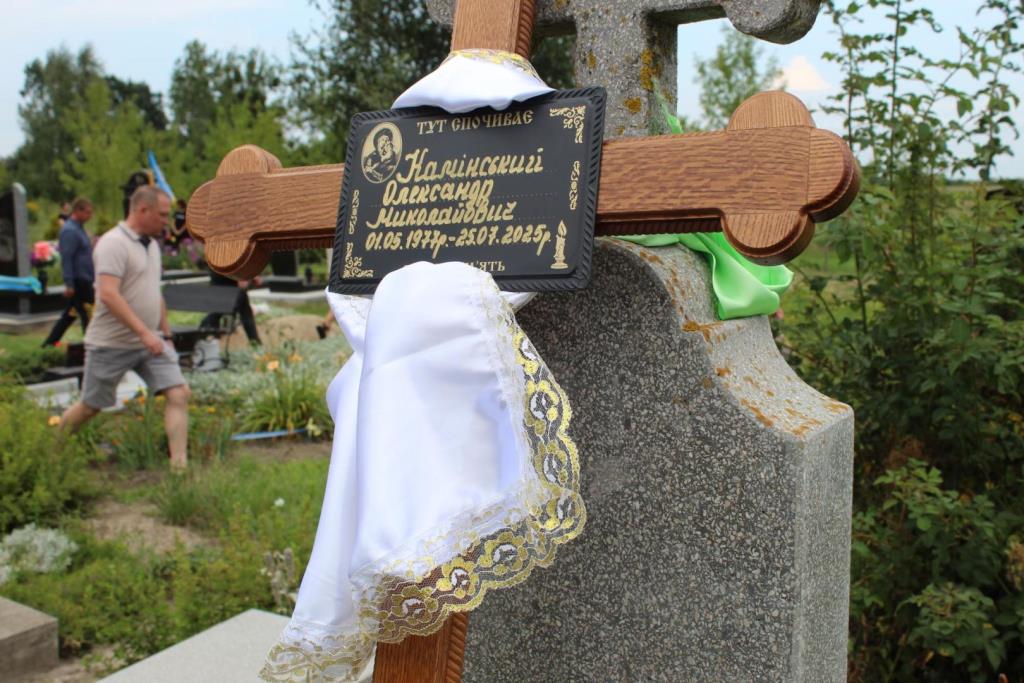 На місцевому кладовищі лунає спільна молитва за душу невинно вбитого воїна Олександра Камінського, а синьо-жовтий стяг, яким була вкрита домовина Героя, військові передають дружині загиблого як символ вільної та незалежної держави, за яку боровся та віддав життя Герой.