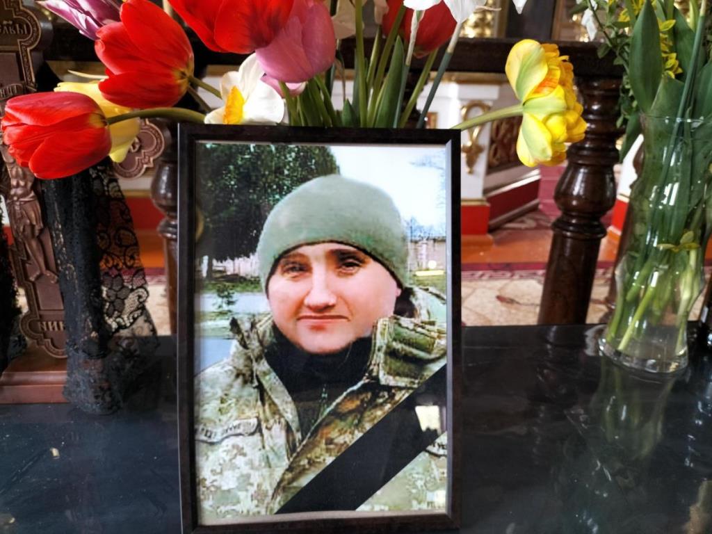 Згорьована дружина міцно тримає в руках національний стяг, яким була покрита домовина.