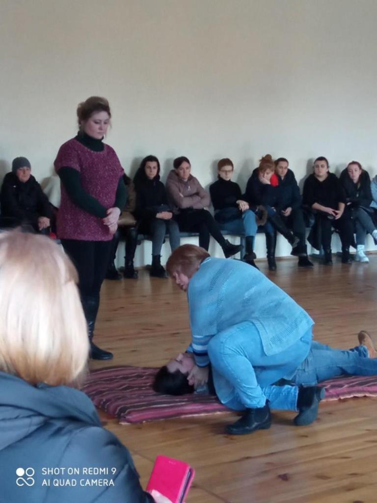 У понеділок, 28 листопада, лекцію-навчання проводили сімейна лікар-терапевт Людмила Гошко та дитячий психолог Олеся Кочкіна. Фахівці розповіли присутнім як діяти в ситуаціях, що загрожують життю постраждалого: як зупинити кровотечу, робити штучне дихання та масаж серця, як діяти, коли людина знепритомніла чи панікує, а також багато іншого.