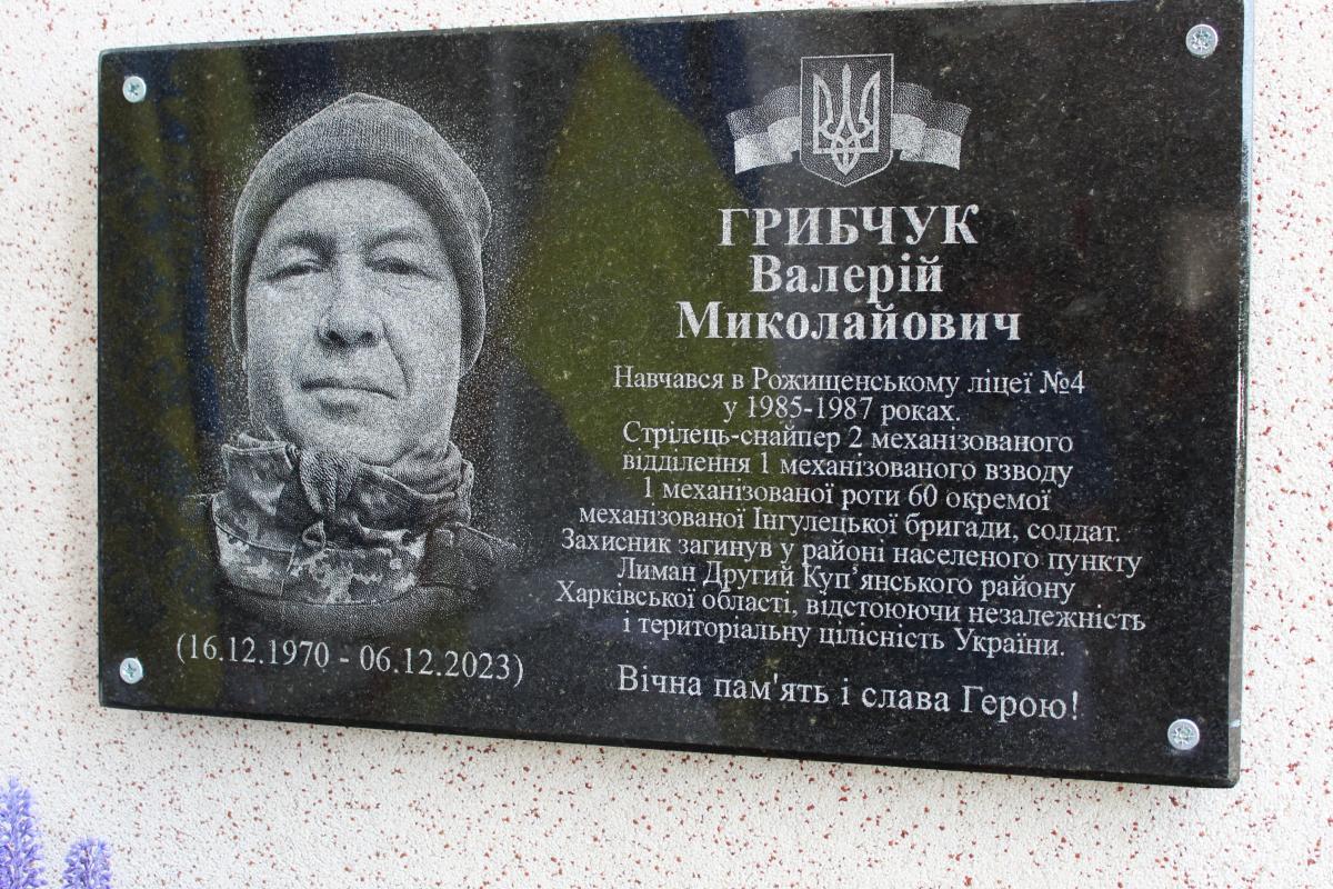 29 серпня, у день, коли в Україні вшановують тих, хто віддав своє життя за свободу та незалежність нашої держави, у Рожищенському ліцеї № 4 відкрили меморіальну дошку колишньому учневі закладу, загиблому у російсько-українській війні Героєві Валерію Миколайовичу Грибчуку, 1970 року народження.
