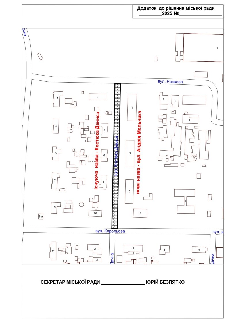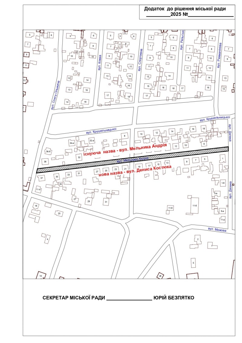 Крім того, директор департаменту містобудування, земельних ресурсів та реклами Веніамін Туз зазначив, що вирішено дещо змінити розташування вулиць Андрія Мельника і Дениса Костюка, адже до міськради звернулися рідні полеглого воїна Дениса Костюка з проханням назвати його ім’ям саме ту частину вулиці, де він мешкав.