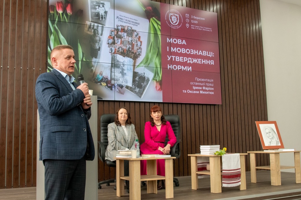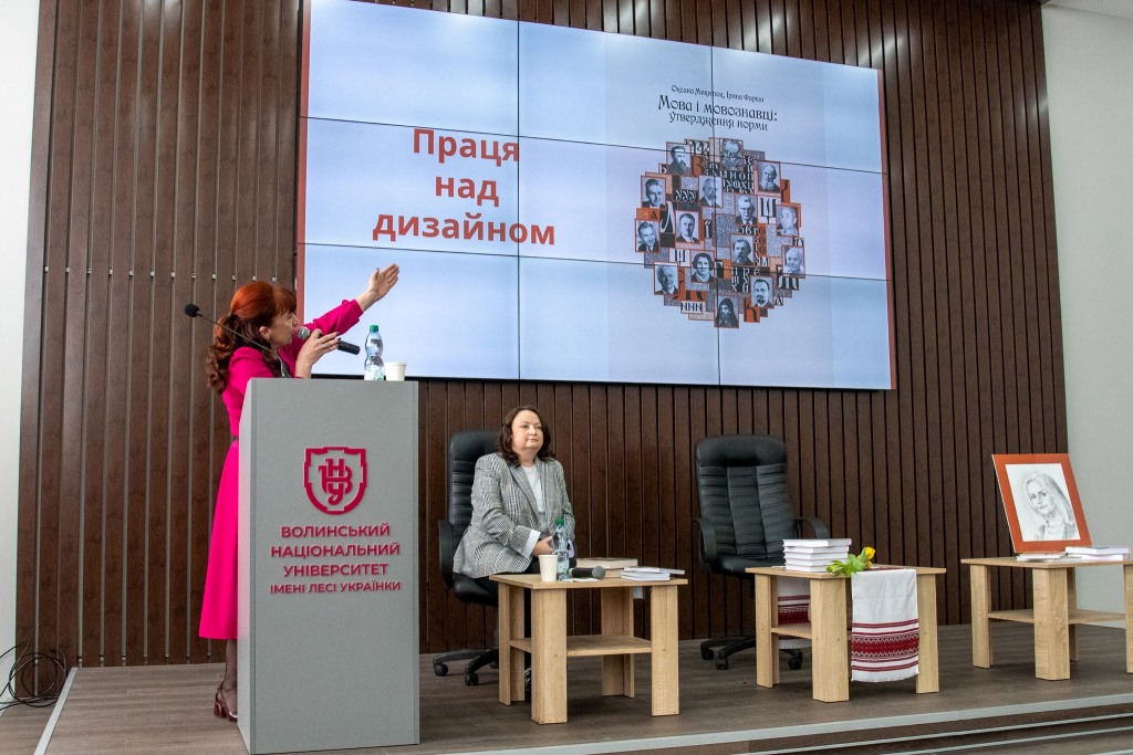 На презентацію книги «Мова і мовознавці: утвердження норми», яка відбулася у стінах Лесиного вишу, приїхали донька Ірини Фаріон Софія Особа, а також колега і подруга, докторка філологічних наук, доцентка кафедри української мови Національного університету «Львівська політехніка» Оксана Микитюк.