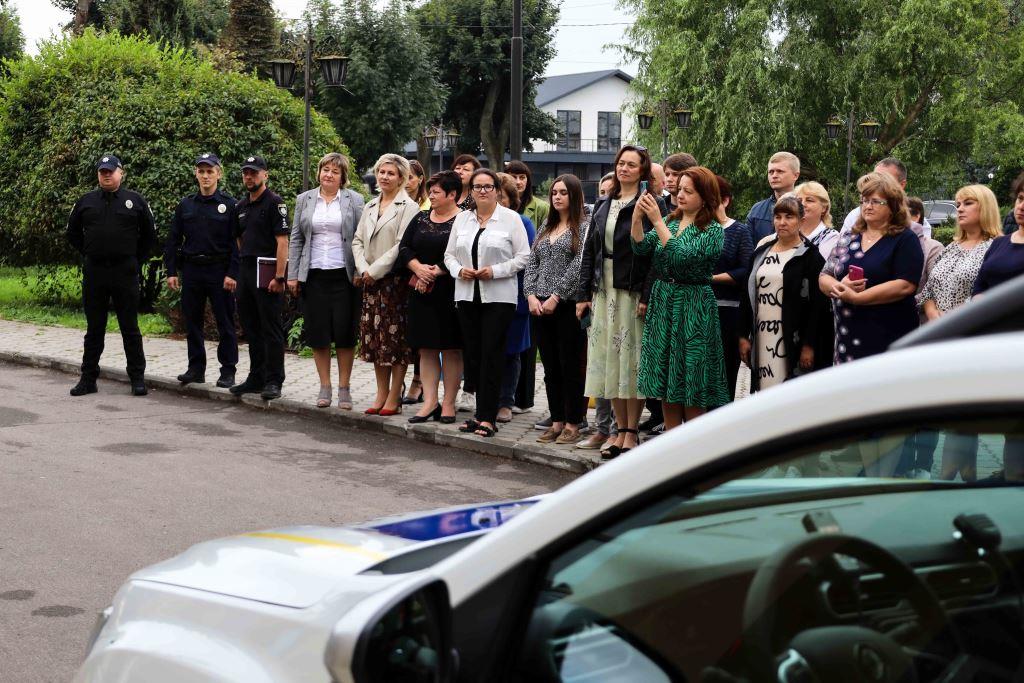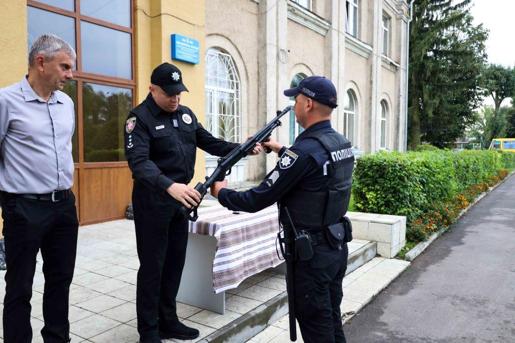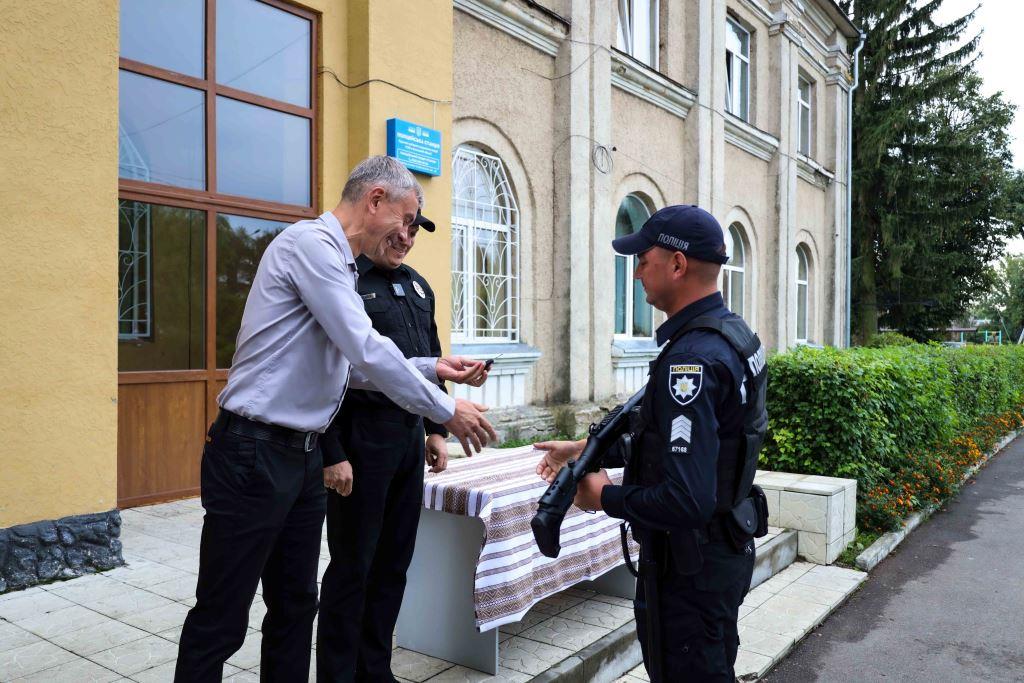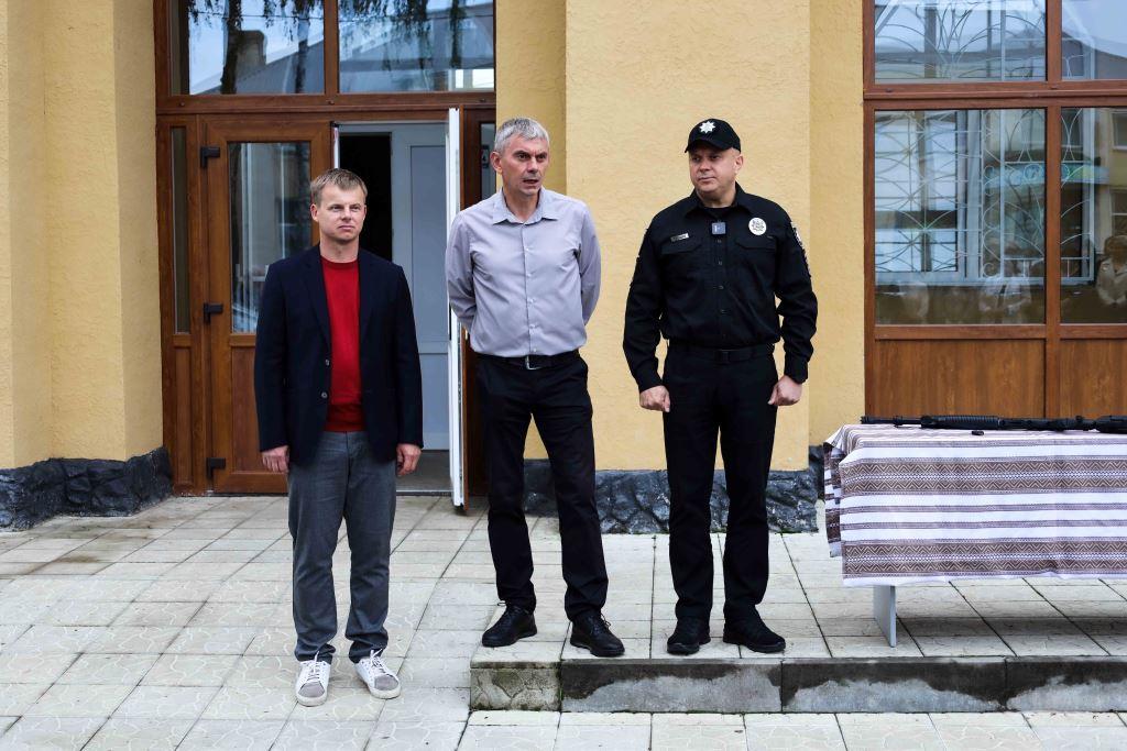 Юрій Крошко з головою громади вручили правоохоронцю ключі від службового автомобіля та зброю.