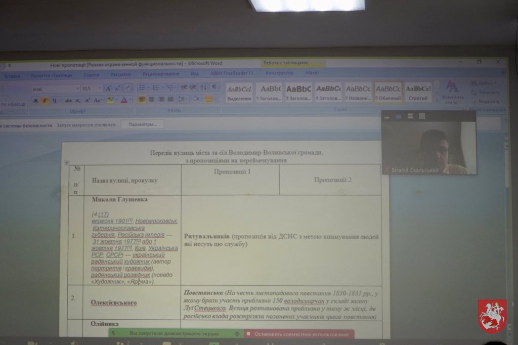 6 липня у Володимирській міській раді відбулося чергове засідання робочої групи з перейменування вулиць міста, на якому розглянули доопрацьовані нові варіанти назв вулиць, що підлягають перейменуванню та сформували остаточний список топонімів, які винесуть на обговорення громадськості.