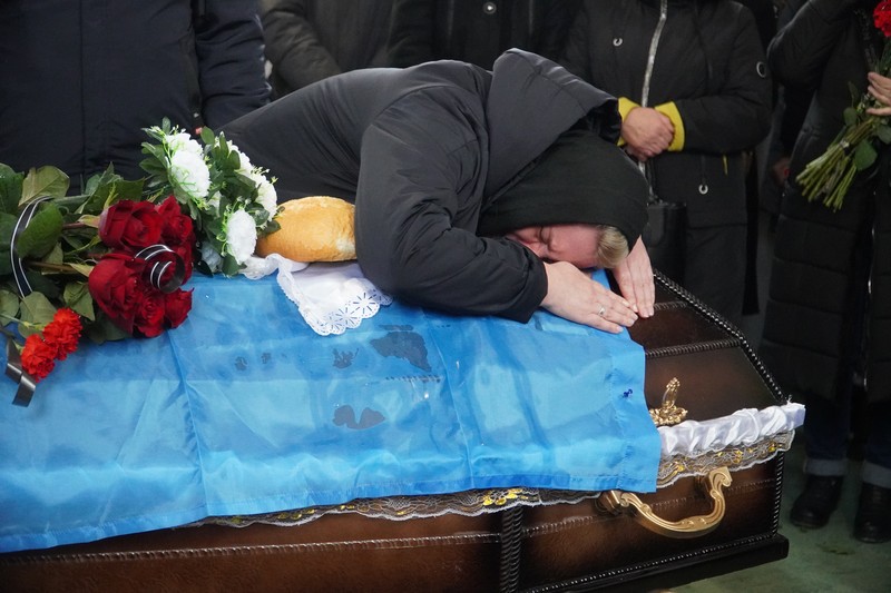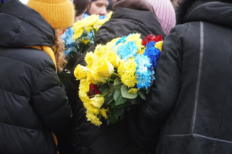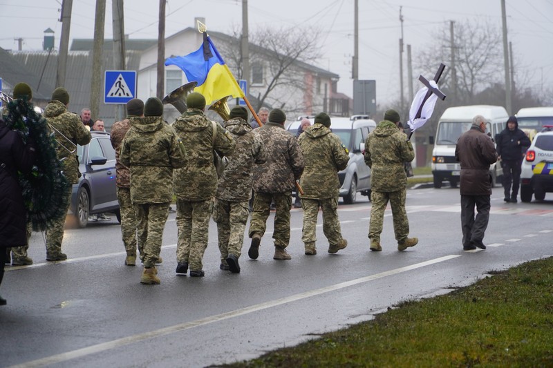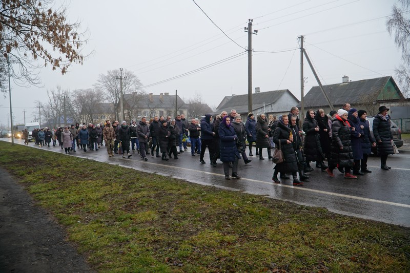 Колона із десятків людей, серед яких найрідніші та найближчі люди Олександра Мазурка, а також друзі, побратими, сусіди, однокласники, духовенство, представники місцевої влади та небайдужі мешканці, рухалась вулицею Устилузькою. Крізь сіру мряку та дрібний дощ яскравими спалахами виблискували великі оберемки синьо-жовтих хризантем та жовтих троянд із чорними стрічками, які несли учасники похоронної процесії.