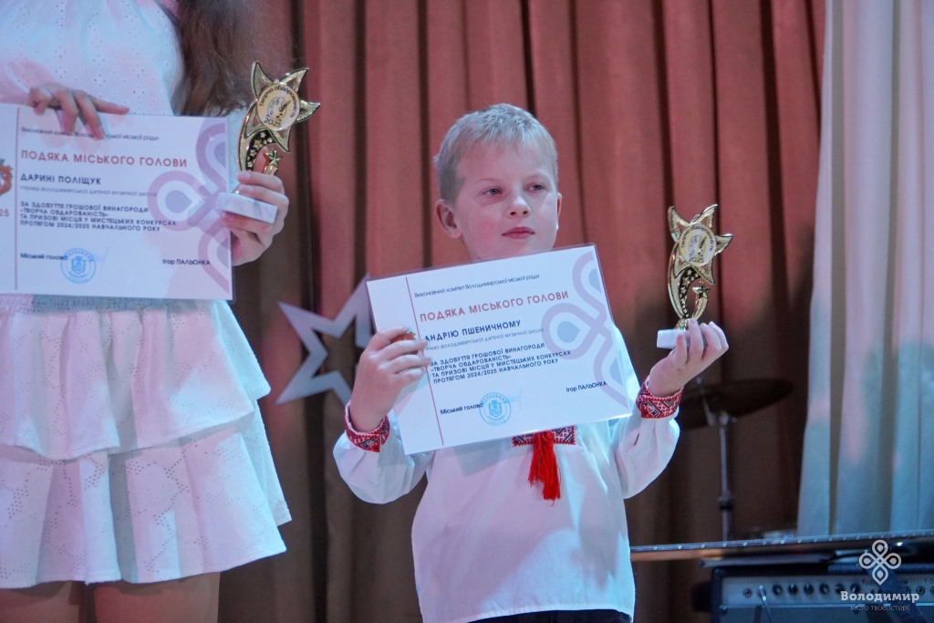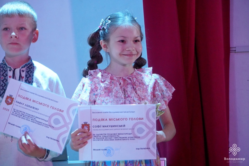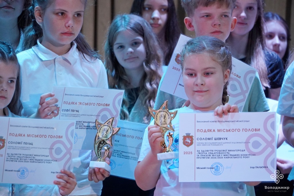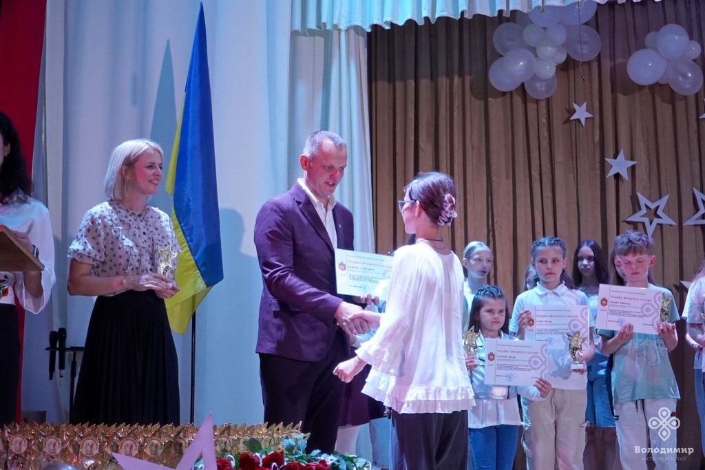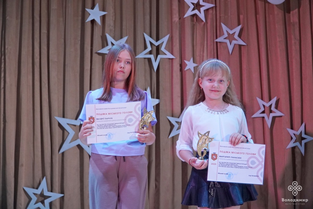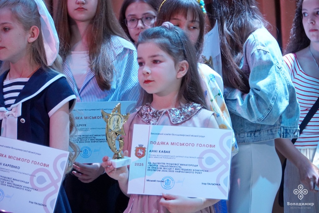 Після привітань очільниця відділу культури і мистецтва Олена Омелюх та Іван Юхимюк вручили Подяки міського голови, грошові винагороди, статуетки «Творча обдарованість» 52-ом учням Володимирської дитячої музичної школи та 107 учням Володимирської дитячої художньої школи імені Миколи Рокицького.