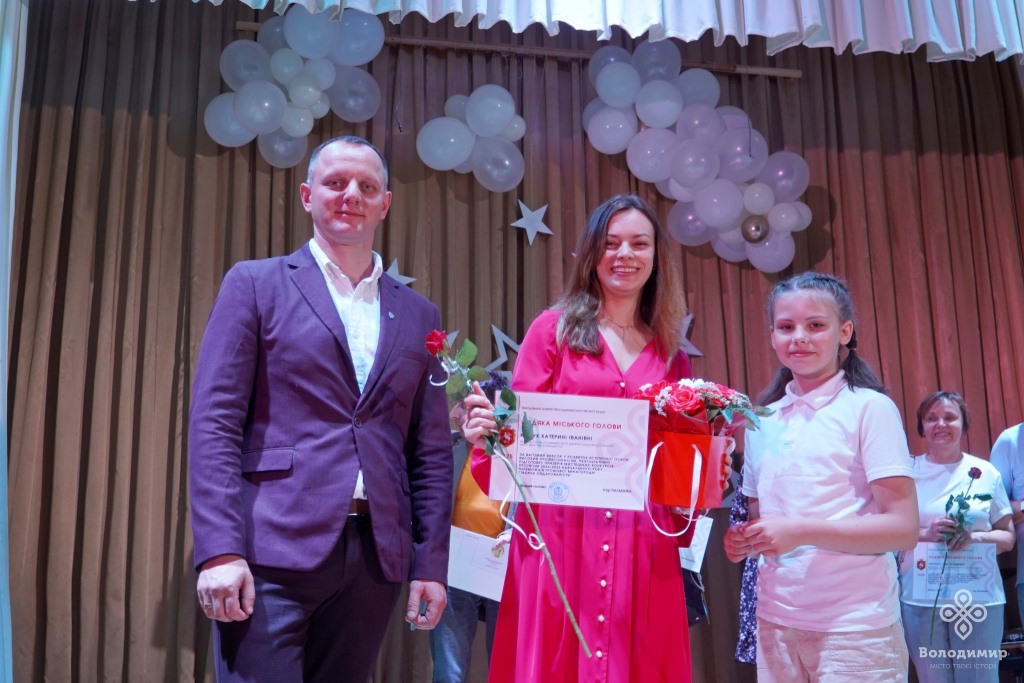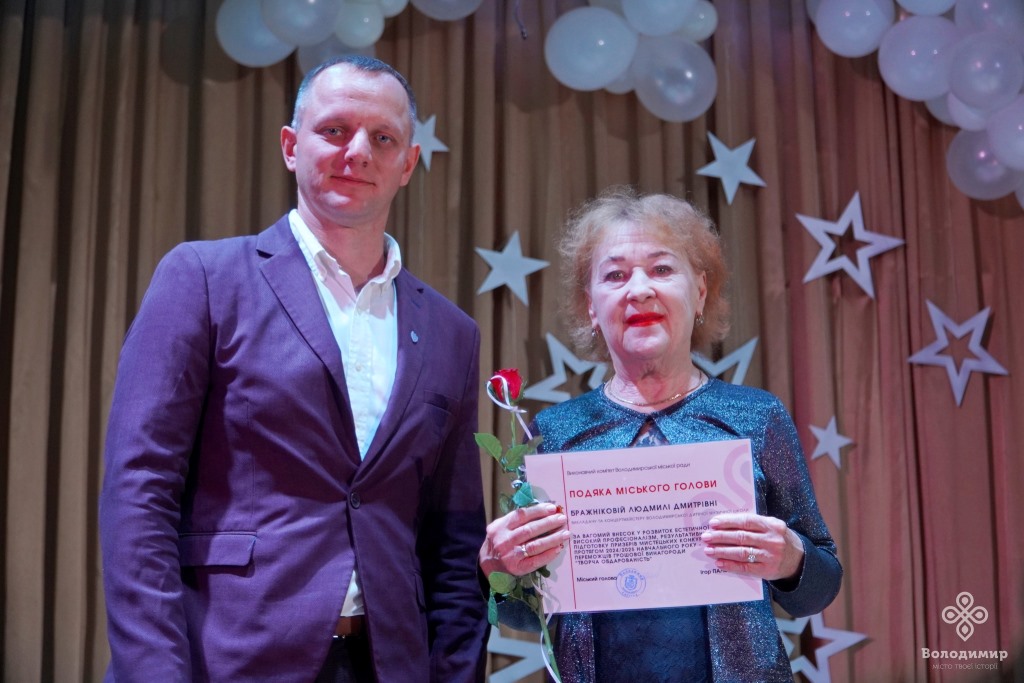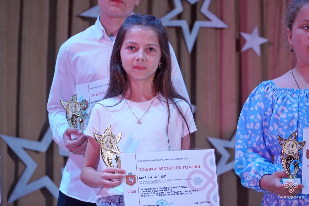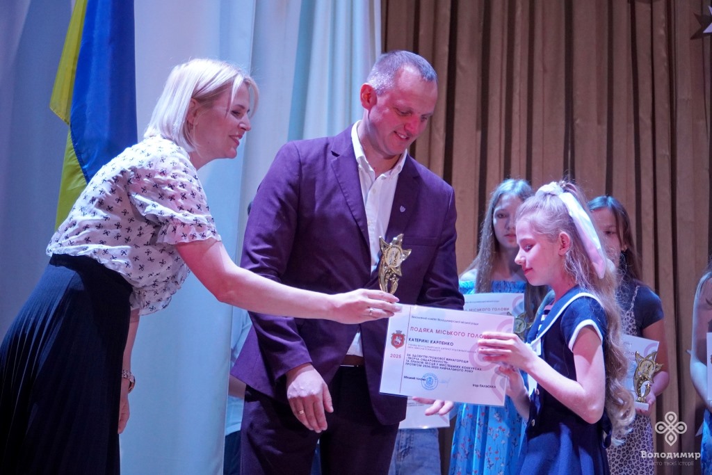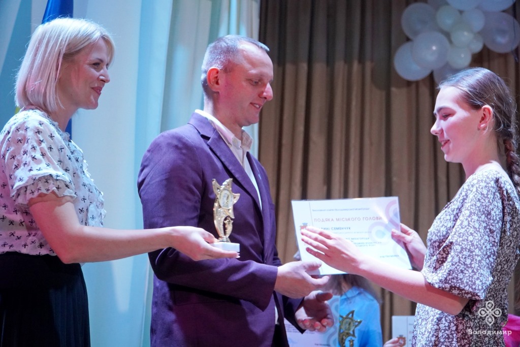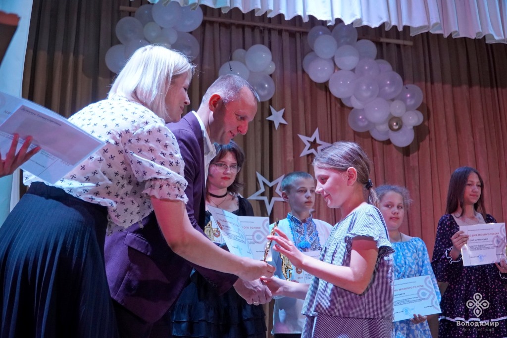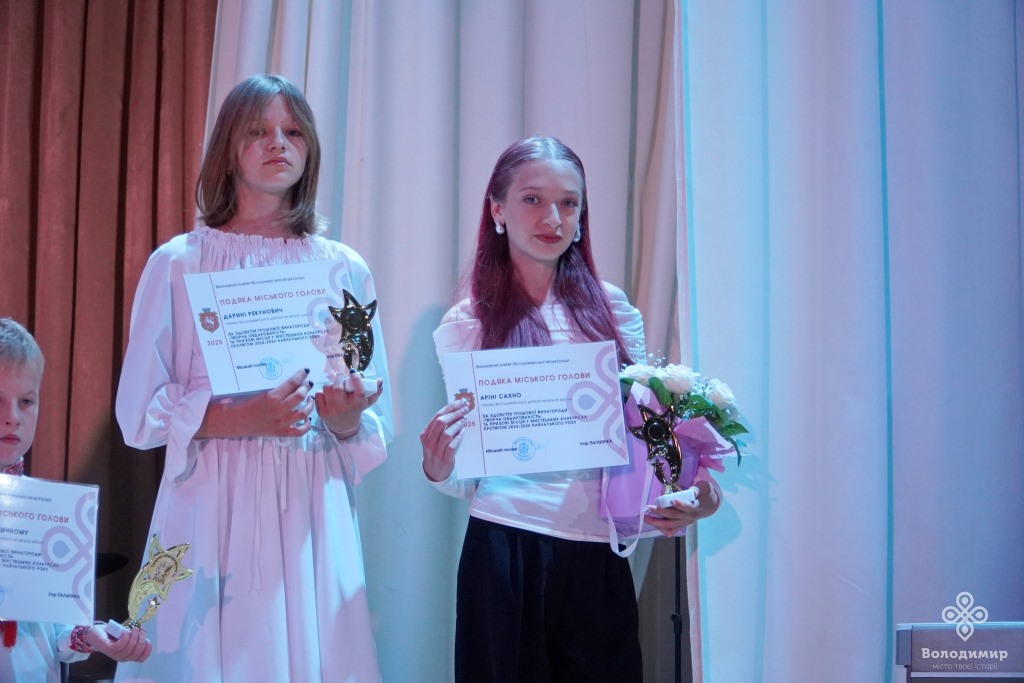 Після привітань очільниця відділу культури і мистецтва Олена Омелюх та Іван Юхимюк вручили Подяки міського голови, грошові винагороди, статуетки «Творча обдарованість» 52-ом учням Володимирської дитячої музичної школи та 107 учням Володимирської дитячої художньої школи імені Миколи Рокицького.