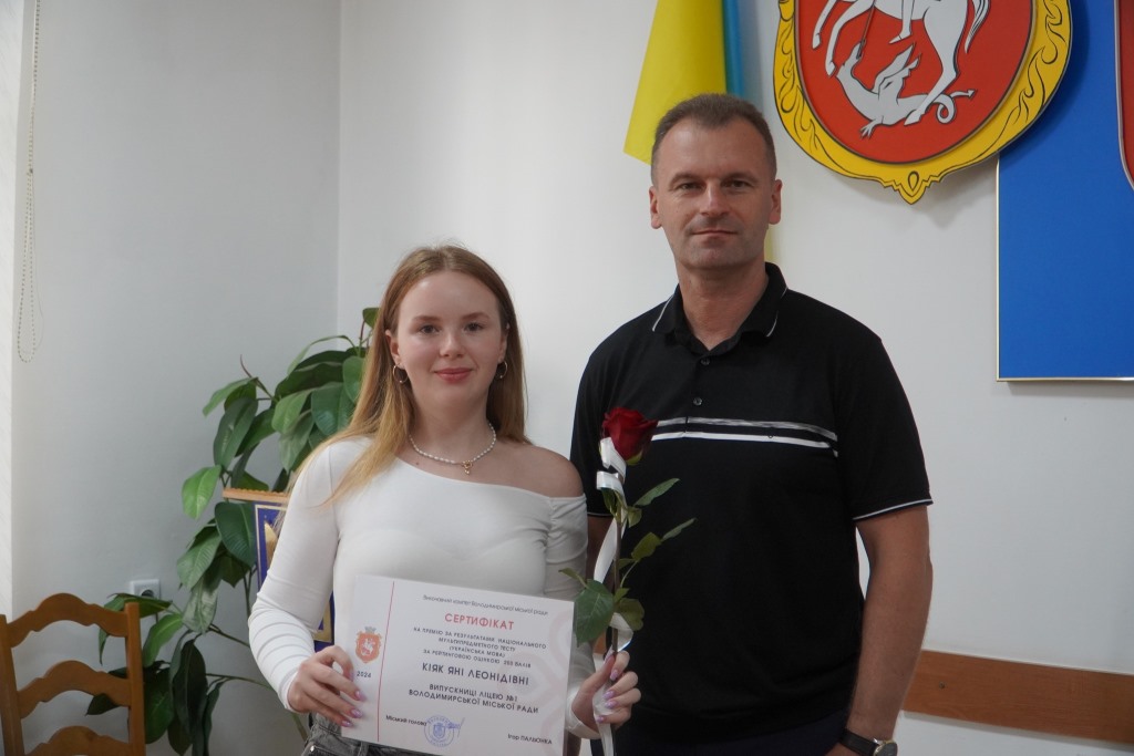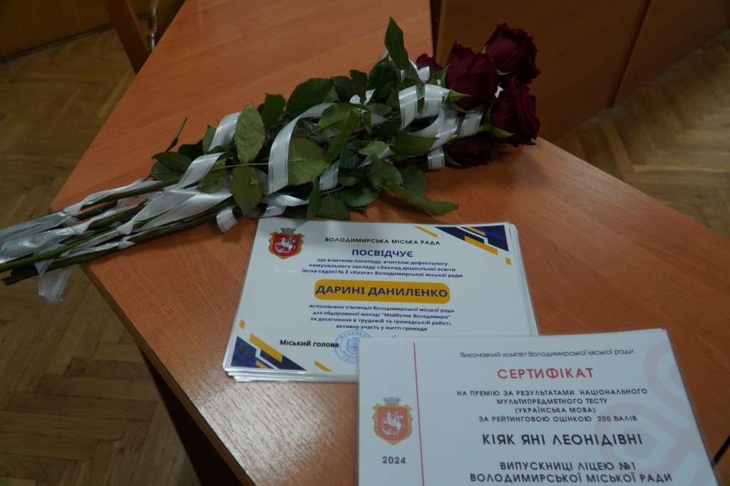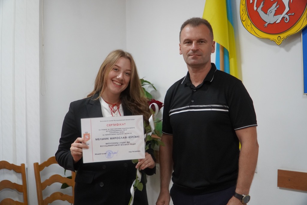 Отже, міський голова вручив сертифікати на отримання премії за високі результати проходження національного мультипредметного тесту з української мови, а саме за рейтингову оцінку 200 балів трьом випускникам середніх навчальних закладів громади: Яні Кіяк (ліцей № 1), Дарині Ничипорук (ліцей № 2) та Мирославі Мельник (ліцей № 3). Усім їм виплачено по 8 тисяч гривень.