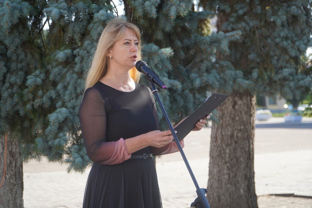 Після хвилини мовчання, яка, як і щодня, починаючи з березня 2022 року, відбулася о 9:00, ведуча заходу Руслана Ватлаєва нагадала присутнім про страшні події, що стались два роки тому.