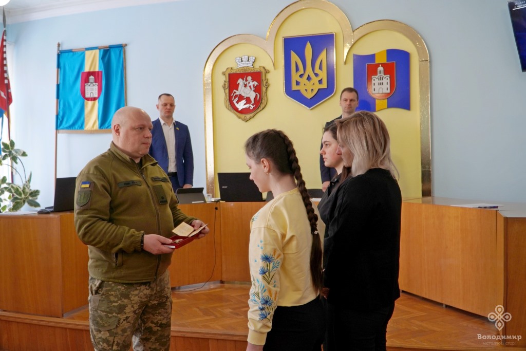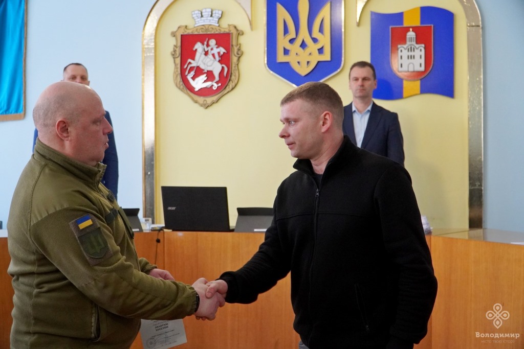 Міський голова Ігор Пальонка спільно з начальником відділення цивільно-військового співробітництва Володимирського районного територіального центру комплектування та соціальної підтримки майором Кирилом Ізотовим вручили відзнаки військовослужбовцям, які виявили мужність та відданість під час захисту України, та членам їхніх родин.