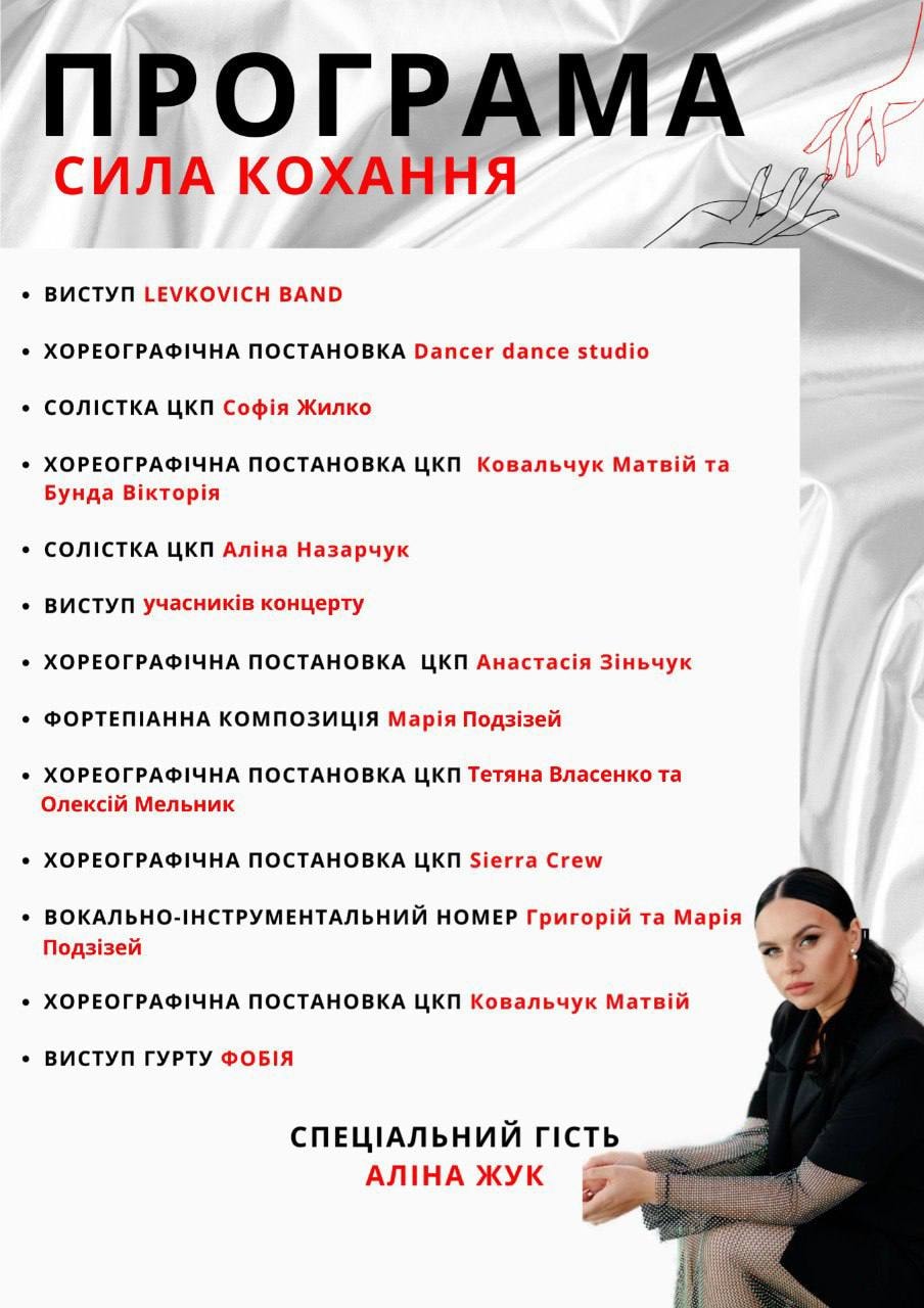 У програмі концерту “Сила кохання” вокальні, хореографічні та інструментальні виступи творчих працівників ЦКП, а також запрошених гостей.