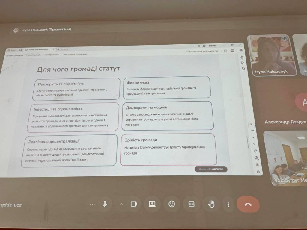 Під час виступу Ірина Гайдучик ознайомила присутніх із юридичною природою Статуту та положеннями Закону № 3703-ІХ, який тепер відносить до жителів громади також і внутрішньо переміщених осіб. Експертка наголосила на важливості залучення громадськості та позитивно відзначила, що у Володимирі вже діють багато важливих інструментів прозорості: онлайн-трансляції засідань, механізм електронних петицій та громадські обговорення бюджету.