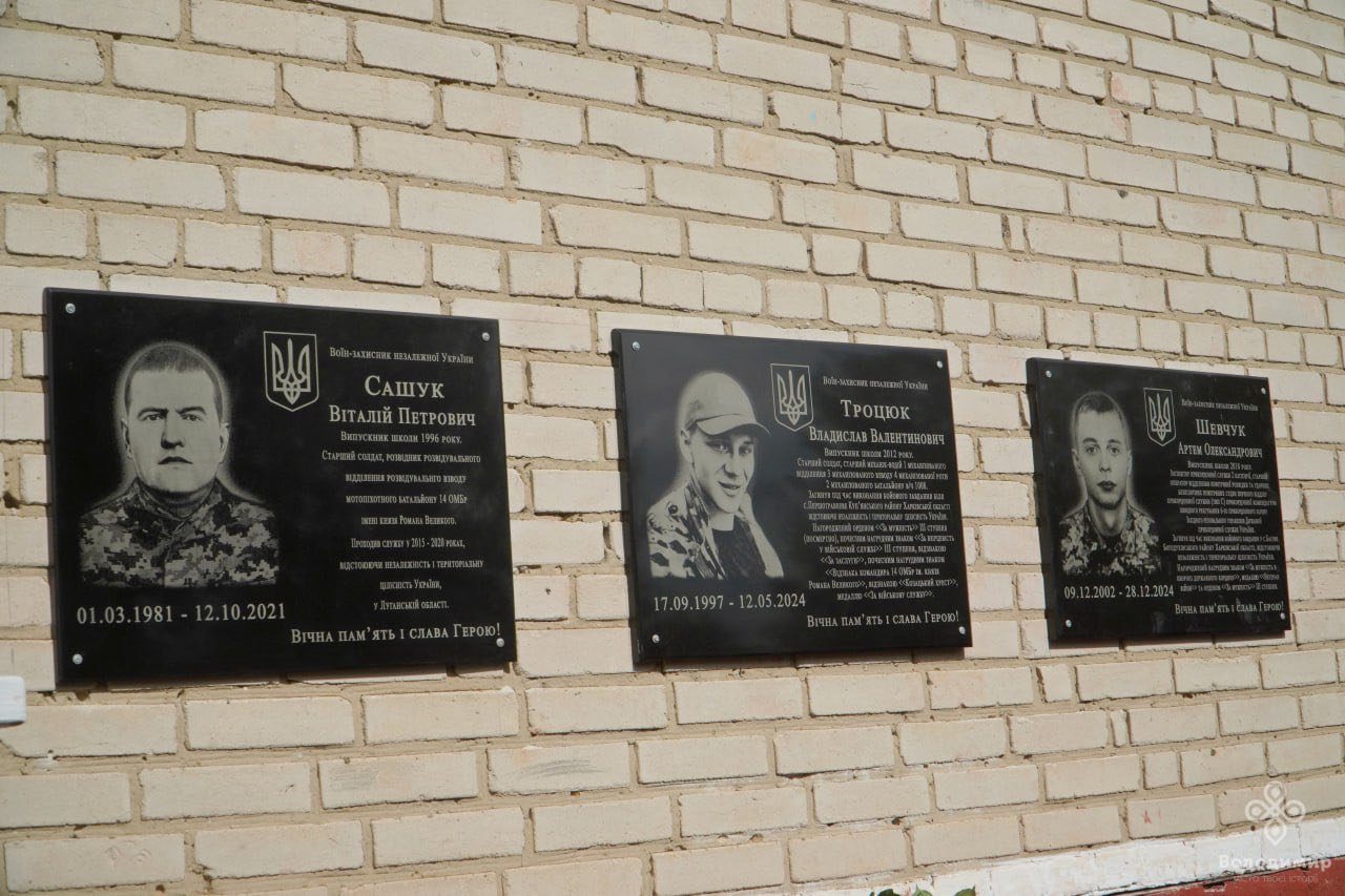 На стіні навчального закладу увічнили пам’ять про героїв, що віддали життя за Україну. До пам’ятної дошки Валерію Мартинюку, яку відкрили у лютому минулого року, додали меморіальну плиту 30-річному Віталію Сашуку, 26-річному Владиславу Троцюку та 22-річному Артему Шевчуку. Ці хлопці уже ніколи не переступлять поріг рідної школи домівки, але назавжди будуть у світлих споминах, педагогів, учнів, рідних, друзів та усієї громади.
