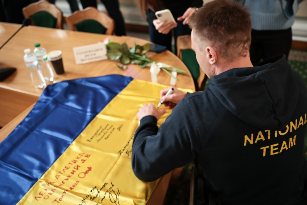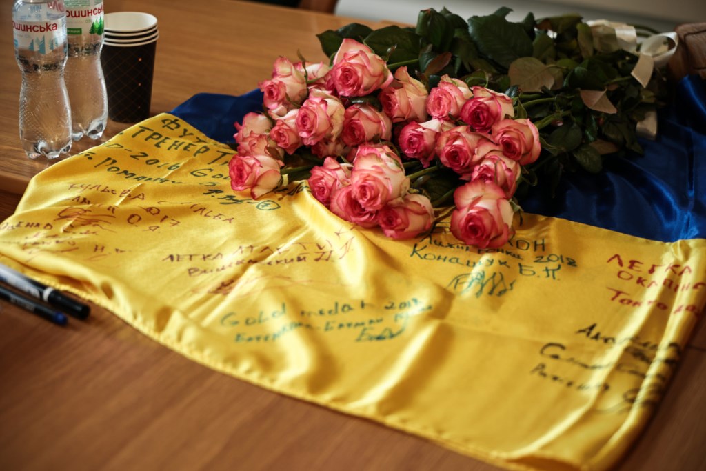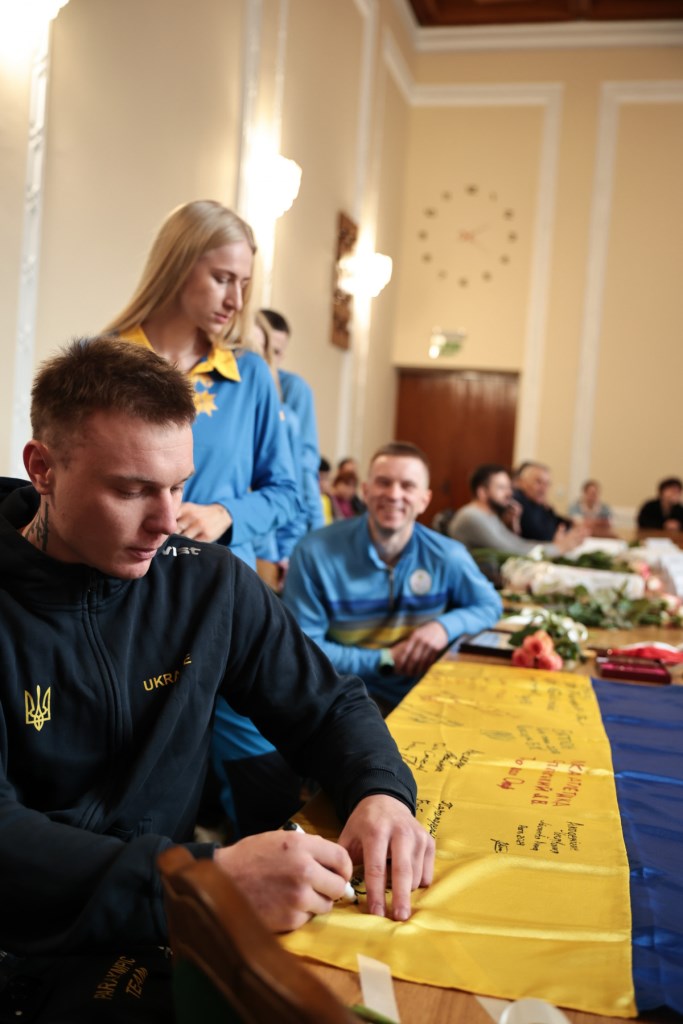 Завершилась зустріч символічним врученням Державного Прапору України, підписаного спортсменами, який вони передали керівникам області на знак єдності, сили і віри у перемогу.