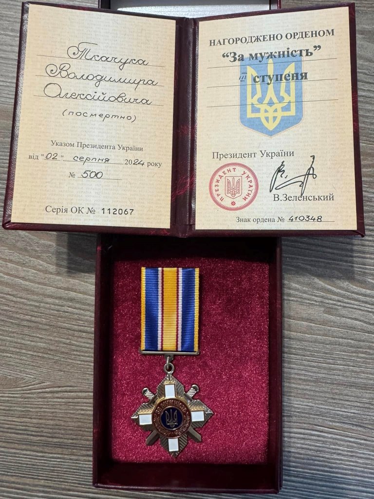 «Сьогодні разом із начальником групи психологічної підтримки персоналу РТЦК Тарасом Борисом, вручили орден «За мужність» III ступеня (посмертно) матері загиблого героя Ткачука Володимира Олексійовича Софіїні Никодимівні та його сину Роману.