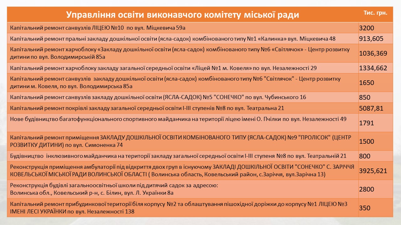 У 2022 також запланували роботи в закладах освіти. Капітальні ремонти: приміщення ЗДО № 9 «Пролісок», пральні ЗДО № 1, харчоблоків ЗДО № 6 та ліцею №1 , санвузлів ліцею № 10, ЗДО № 5 та № 6; даху ЗЗСО № 8. На ліцей Олени Пчілки чекає будівництво багатофункціонального спортивного майданчика, а восьму школу — інклюзивного майданчика. Біля другого корпусу ліцею № 3 Лесі Українки облаштують територію.