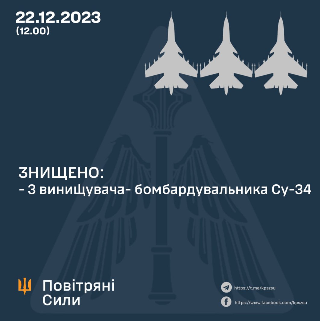 «Уночі 22 грудня 2023 року на шматку збитого «шахеда» із серією «ЬІ» отримав послання від окупантів: «сDохните сYки». Чудова ідея! Ось вам наша відповідь! Сьогодні, опівдні, на Південному напрямку – мінус три російські винищувачі-бомбардувальники Су-34. Вєчного польота «братья», – написав Олещук.