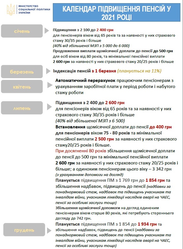 Найбільш захищеними будуть пенсіонери, які мають повний страховий стаж, тому працювати “в білу” вигідніше. Так, у осіб, старших за 65 років, які мають страховий стаж 30 років (жінки) та 35 років(чоловіки), мінімальна пенсійна виплата протягом 2021 року зросте на 500 гривень, і вони будуть отримувати не менше 2600 гривень. Також продовжиться програма доплат для пенсіонерів старших за 80 років, що мають страховий стаж 20/25 років, та розпочнеться програма для пенсіонерів старших за 75 років з повним стажем. У календарі відображені дати індексації пенсій та перерахунку пенсій працюючим пенсіонерам.
