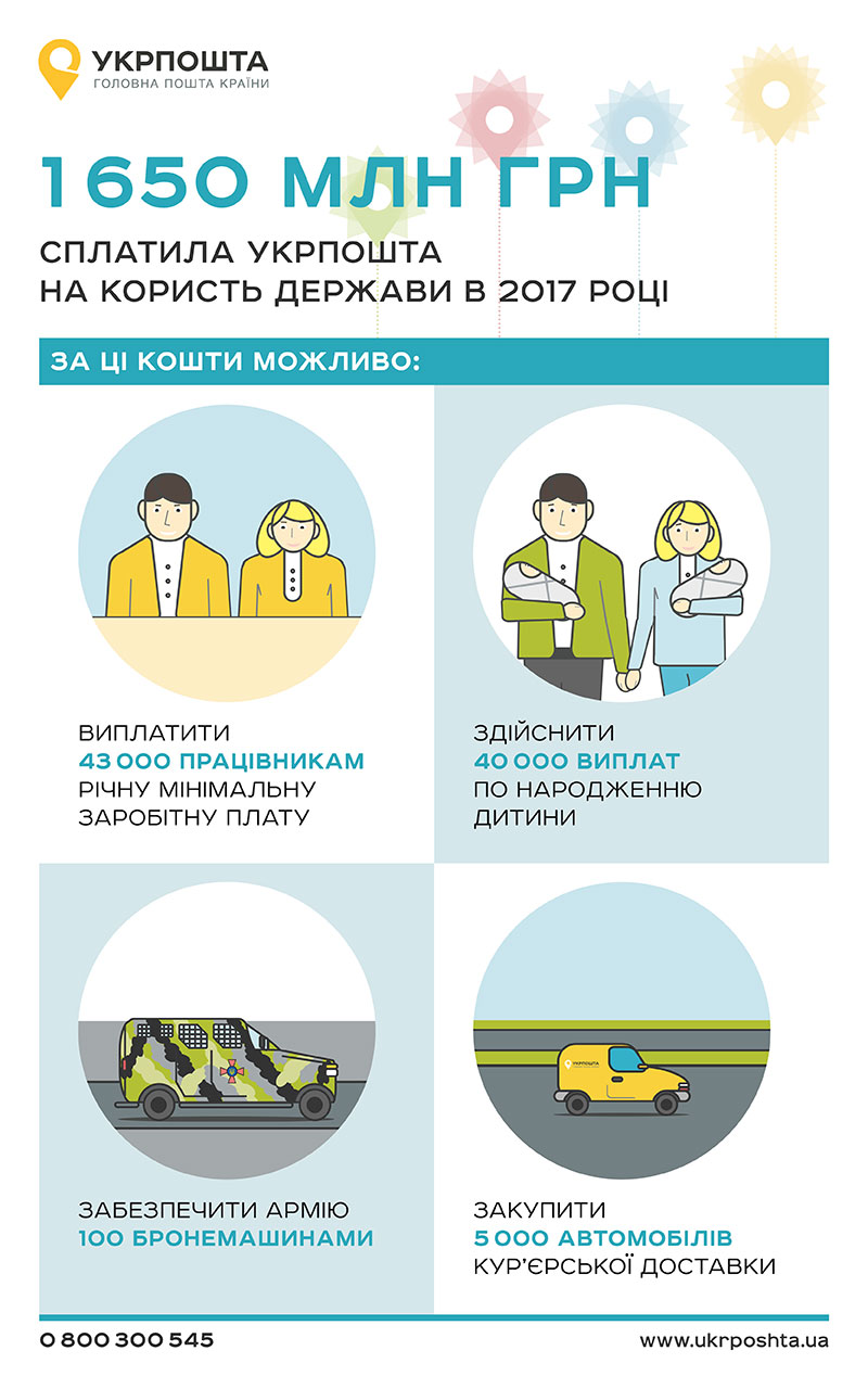 Так, сума відрахувань “Укрпошти” до бюджету країни еквівалентна майже 40 тисячам виплат по народженню дитини, річним мінімальним зарплатам 43 тисяч працівників, за ці кошти можна закупити 5 тисяч автомобілів для кур’єрської доставки або 100 бронемашин для українського війська.
