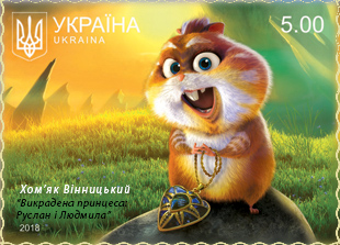 На одній з двох поштових марок, виконаних на самоклейному папері, зображені головні герої на фоні старовинного Києва: принцеса Міла, її батько – київський князь Володимир та коханий – мандрівний актор Руслан. На іншій поштовій марці – Хом’як Вінницький.