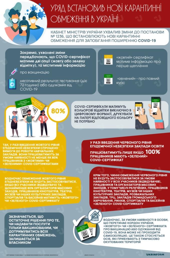 Водночас обмеження жовтого рівня епіднебезпеки не будуть застосовуватися, якщо всі учасники (відвідувачі) та щонайменше 80 % організаторів масових заходів, працівників кафе та ресторанів, кінотеатрів, театрів, музеїв чи інших культурних закладів, спортзалів та басейнів матимуть хоча б одне щеплення або чинний (72 год.) результат ПЛР- чи експрес-тестування.