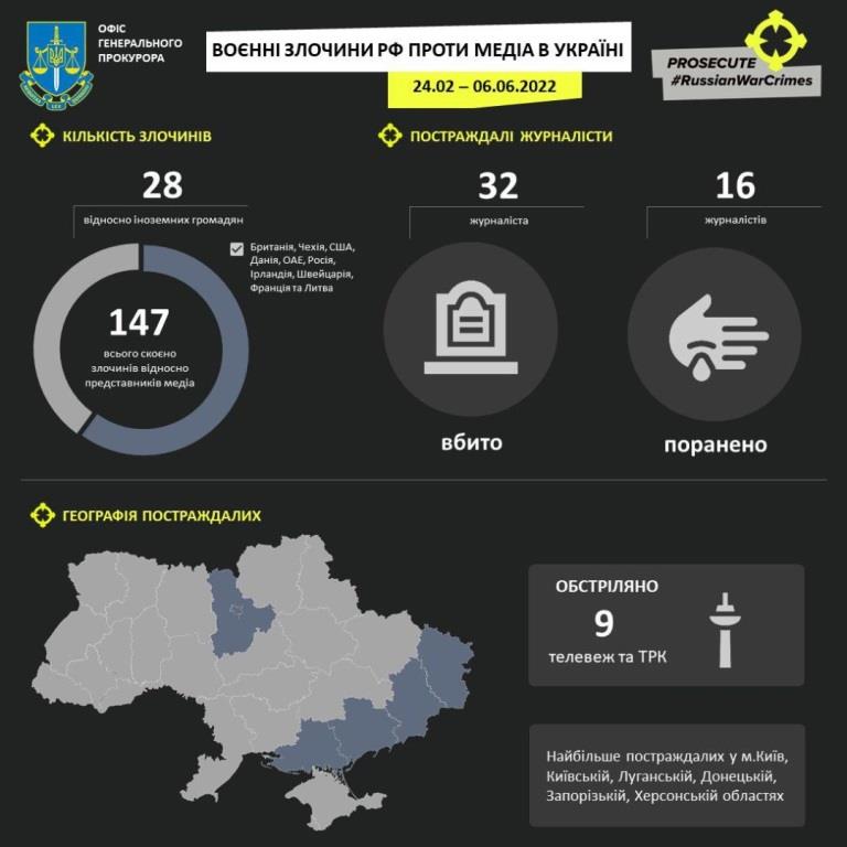 Прокурори здійснюють процесуальне керівництво у кримінальних провадженнях щодо злочинів рф відносно 147 представників ЗМІ, 28 з них є іноземцями.