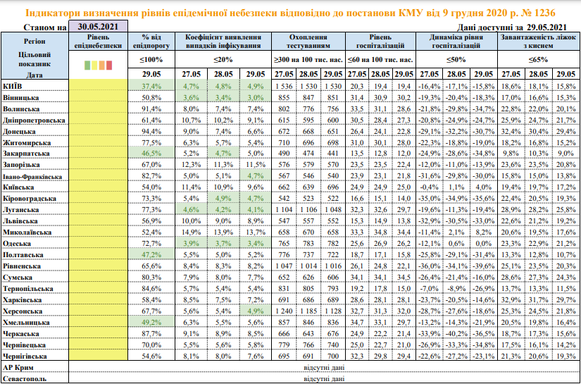 Станом на 30 травня усі області України перебувають у «жовтій» зоні епідеміологічної небезпеки.