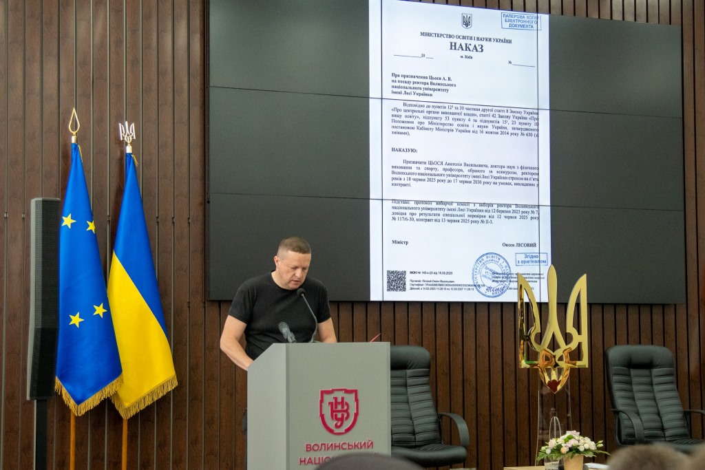 «Я дякую кожному членові нашого колективу за велику підтримку і довіру, які отримав. Ця перемога – не лише визнання моєї роботи, а й результат нашої спільної праці, віри в університет та його майбутнє, – наголосив Анатолій Цьось у своїй першій промові після офіційного оголошення наказу Міністра освіти і науки про призначення на посаду ректора. – Пишаюсь тим, що наш університет гуртує довкола себе всіх, хто розуміє, що співпраця із ЗСУ, волонтерство, ефективна ветеранська політика зараз надважливі. Це було і залишається нашим пріоритетом. Ми купували військове спорядження, безпілотні апарати, засоби радіозв’язку та інше необхідне обладнання на понад мільйон гривень. А сьогодні – це більше 3,5 млн гривень позабюджетних коштів, які ми зібрали на благодійних ярмарках та через перерахунок одноденного заробітку, і ця робота продовжиться».