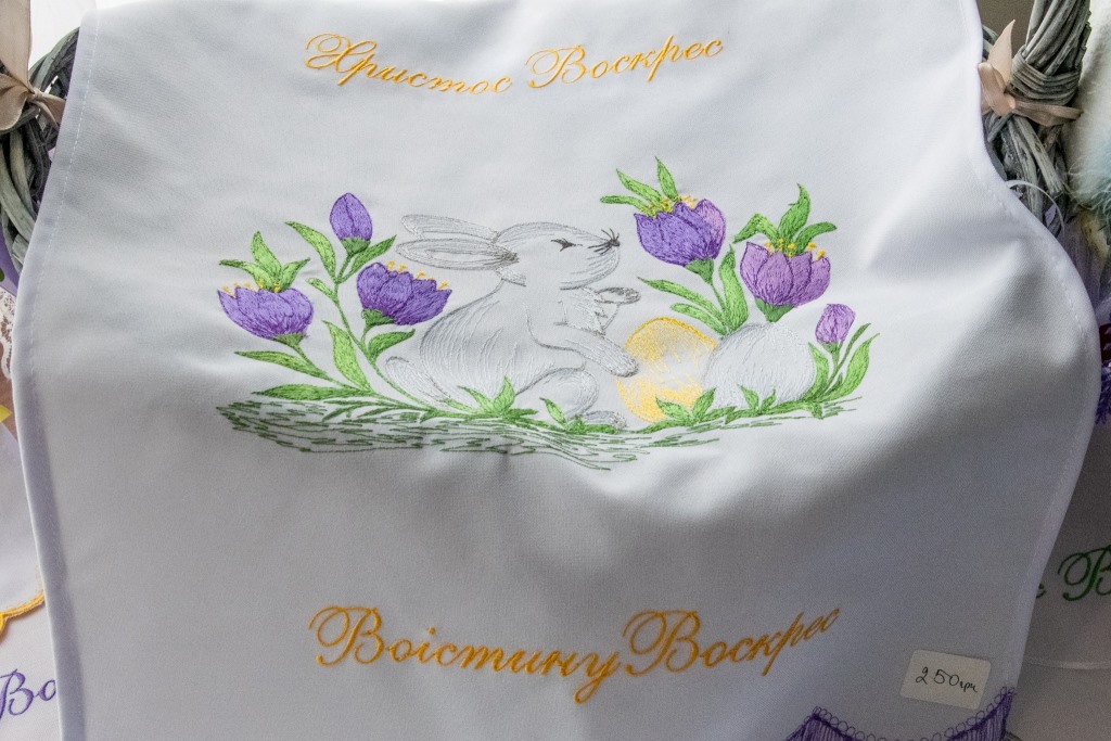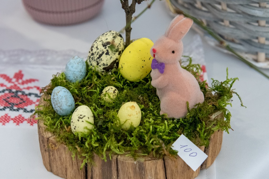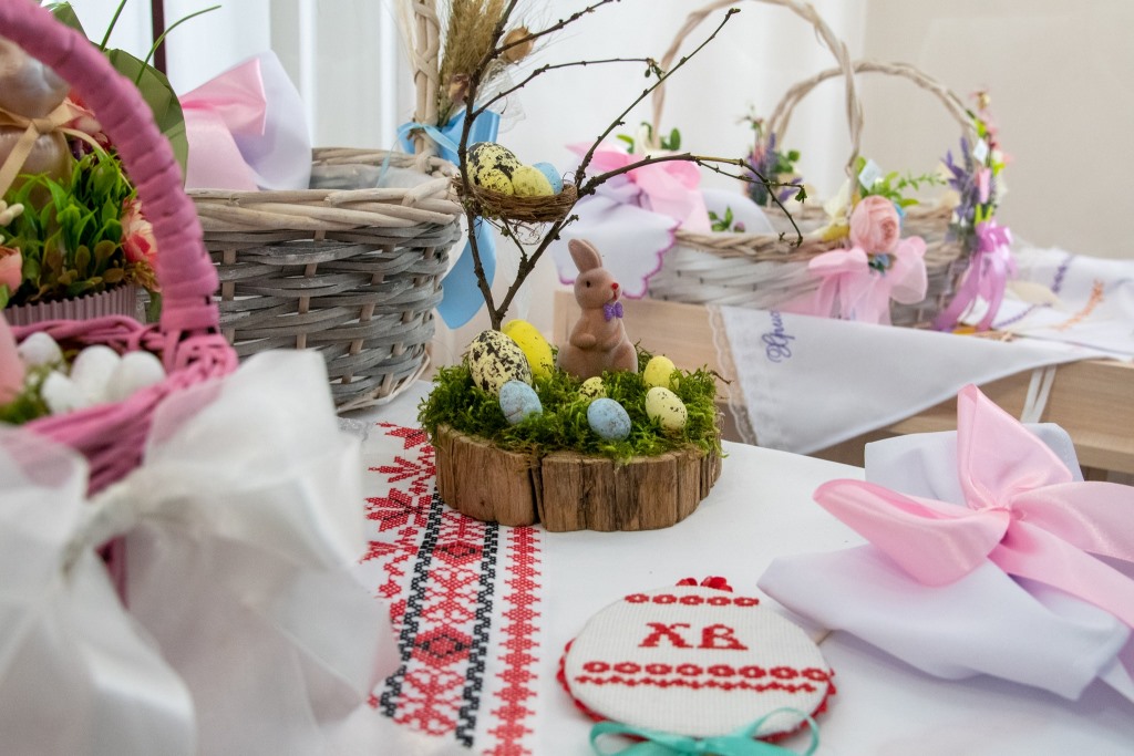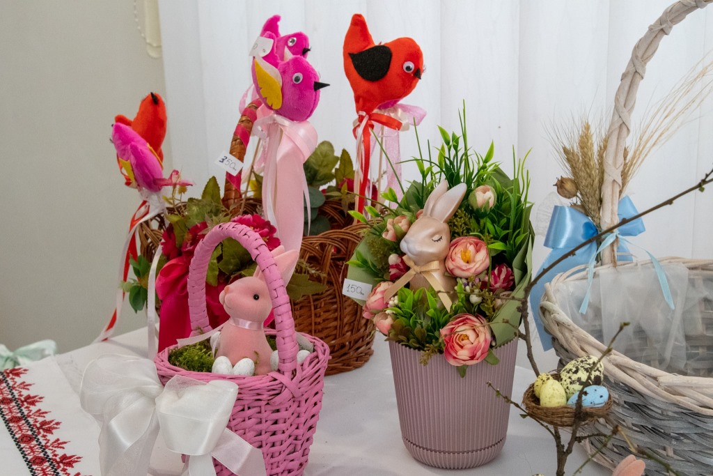 Серед експонатів – оздоблені великодні кошики, флористичні пасхальні композиції, кожна з яких має своє унікальне оформлення з квітів та декоративних елементів, дизайнерські картини, а також барвисті вишиті тематичні скатертини, рушники та серветки.