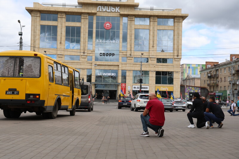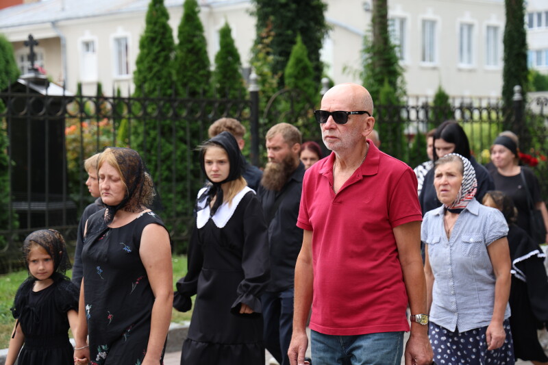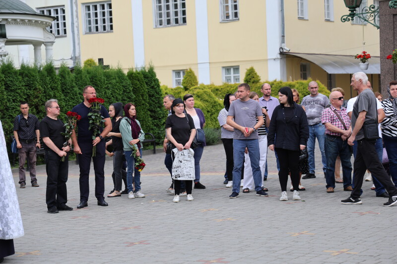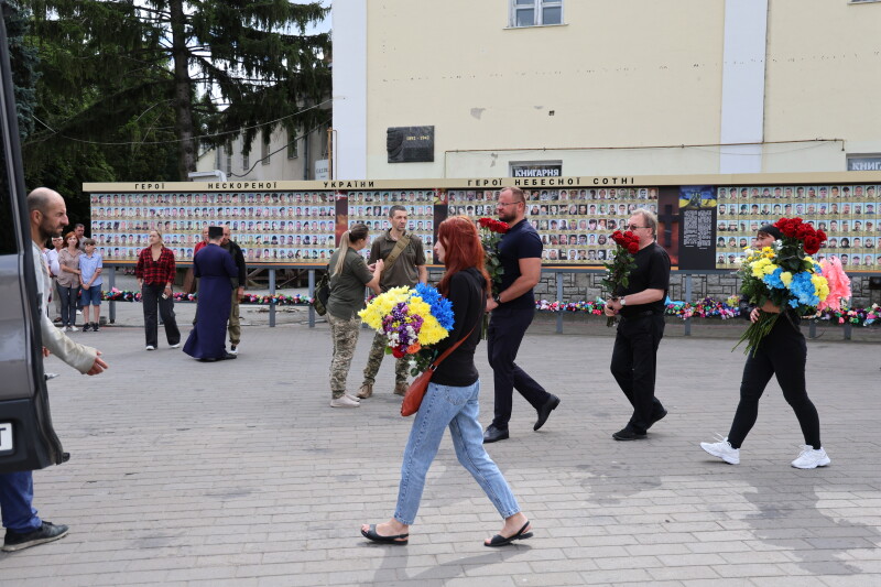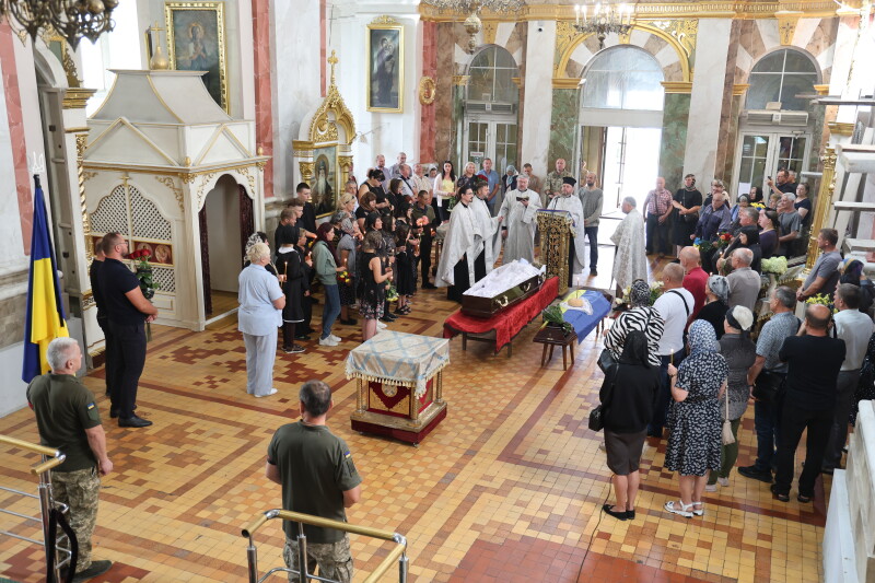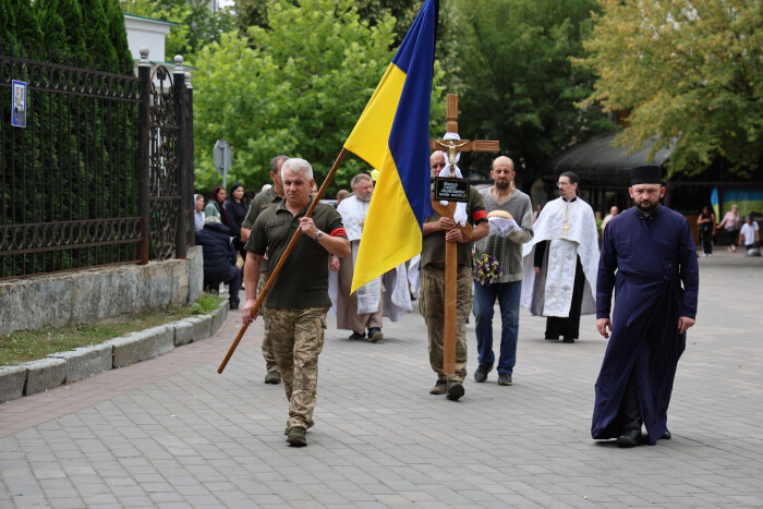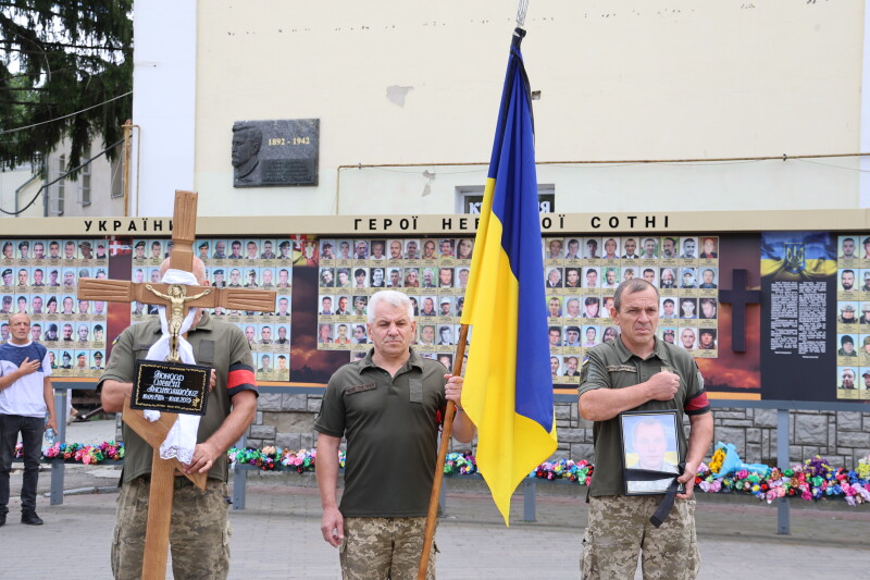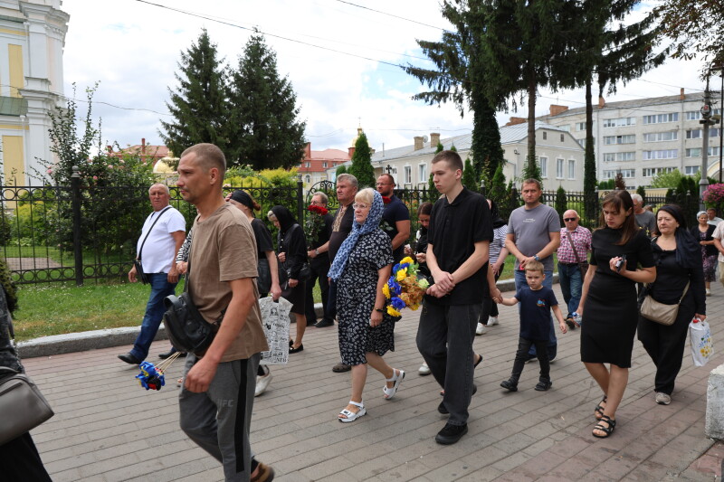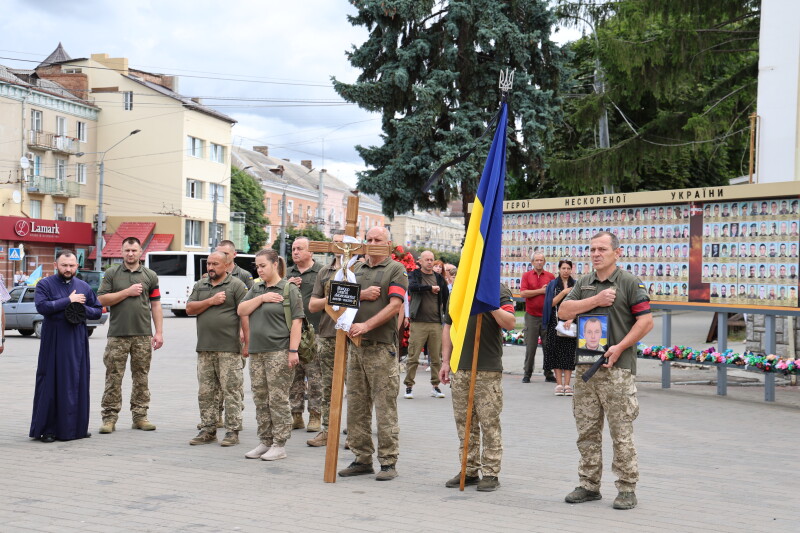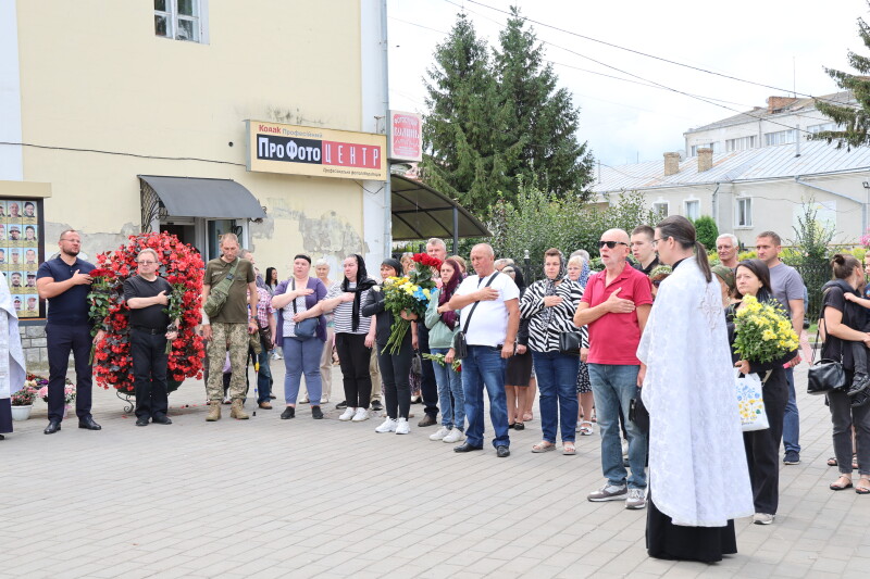 Після завершення заупокійного богослужіння труну з тілом захисника пронесли Театральним майданом. Біля пам’ятного фотостенду загиблим Героям траурна процесія зупинилася і виконала Державний Гімн.