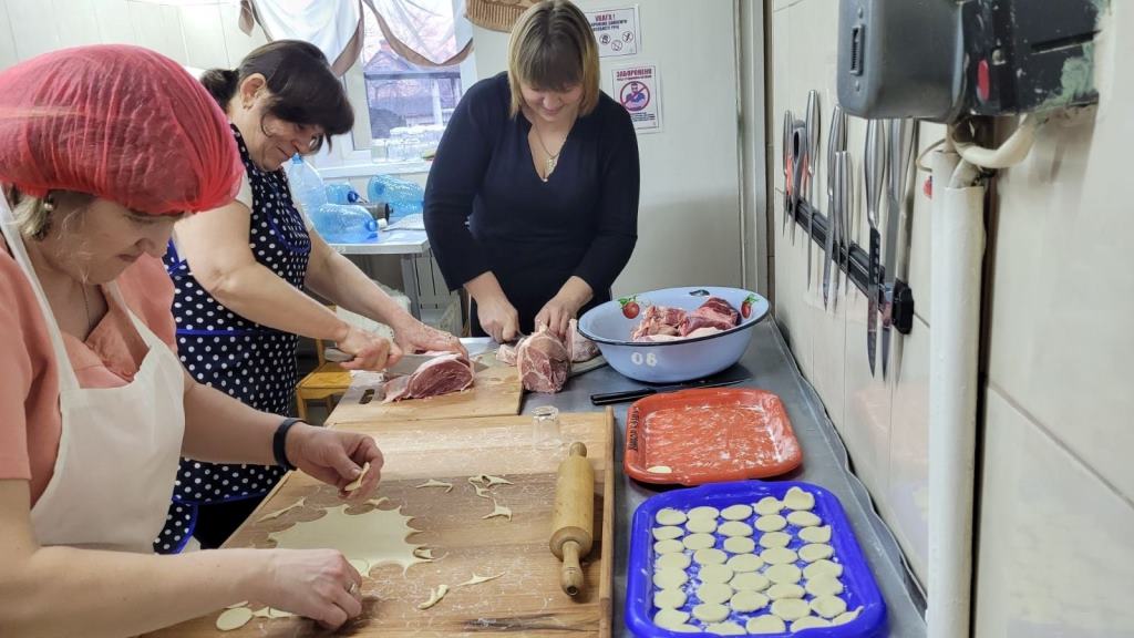 Якщо у перші дні війни волонтерську допомогу з харчуванням надавали місцеві підприємці, які безплатно годували переселенців та тероборонівців у своїх закладах, то зараз цей процес повністю налагоджений в установах освіти. Щодня на кухнях шкіл та садочків ліплять тисячі вареників та пиріжків з картоплею, м’ясом та сиром, варять сотні літрів борщу та інших традиційних українських страв. Усі борошняні страви, що виліплені протягом дня, заморожують, а відварюють та смажать їх безпосередньо перед поїздкою на передову. Такі передачі для військовослужбовців організовуються кілька разів на тиждень. Для того, щоб вареники доїхали свіжими, їх попередньо заливають розтопленим смальцем.