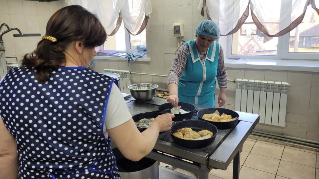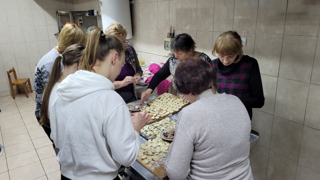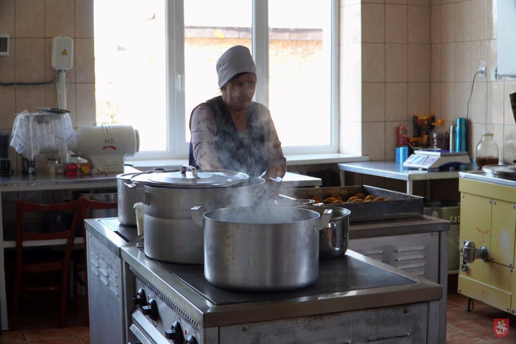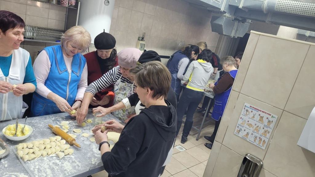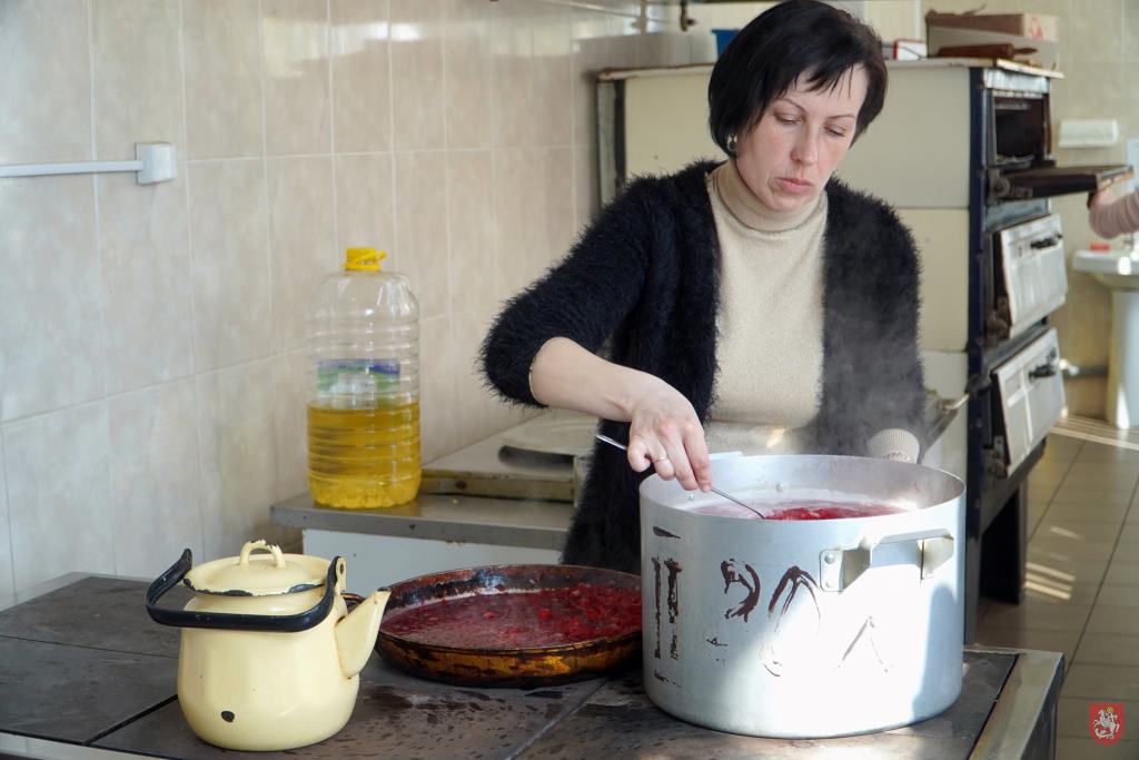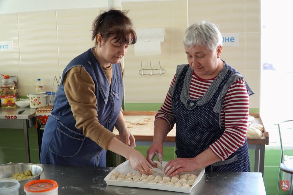 Якщо у перші дні війни волонтерську допомогу з харчуванням надавали місцеві підприємці, які безплатно годували переселенців та тероборонівців у своїх закладах, то зараз цей процес повністю налагоджений в установах освіти. Щодня на кухнях шкіл та садочків ліплять тисячі вареників та пиріжків з картоплею, м’ясом та сиром, варять сотні літрів борщу та інших традиційних українських страв. Усі борошняні страви, що виліплені протягом дня, заморожують, а відварюють та смажать їх безпосередньо перед поїздкою на передову. Такі передачі для військовослужбовців організовуються кілька разів на тиждень. Для того, щоб вареники доїхали свіжими, їх попередньо заливають розтопленим смальцем.
