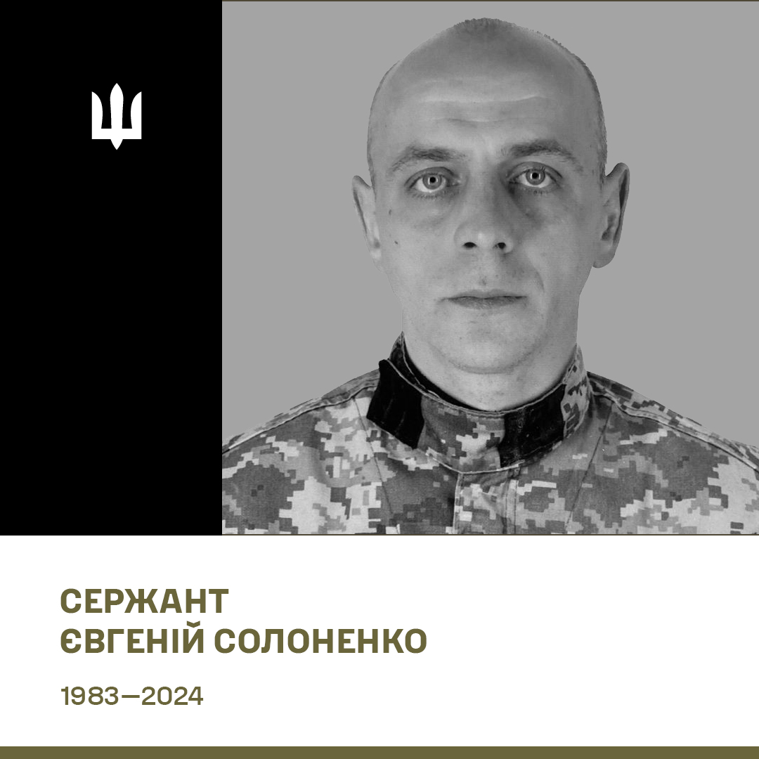 Сержант Солоненко Євгеній Євгенійович, 1983 року народження, отримав над важкі поранення 4 вересня 2023 року під час бойових дій з військовими формуваннями російської федерації поблизу населеного пункту Пролетарське Харківської області.