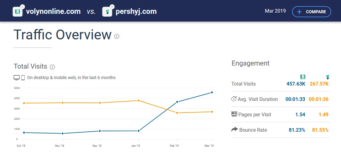 За підсумками березня інтернет-видання «Волинь Online» досягло рекордної позначки за увесь час існування сайту, отримавши понад 457 тисяч переглядів, що на 25 % більше, ніж у лютому. Видання другий місяць поспіль входить до списку лідерів серед інформаційних ресурсів області, випередивши понад десяток інтернет-видань за рівнем відвідуваності.