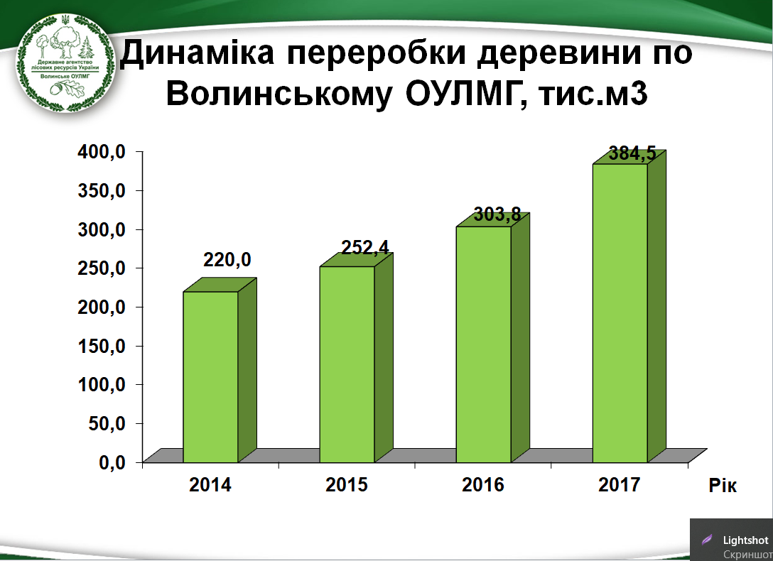 Загалом у звітному періоді переробили 384,5 тис. куб. м деревини, що на 80,7 тис. куб. м більше, ніж за 2016 рік.