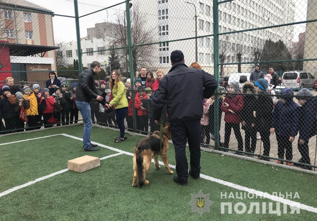 Молодший інспектор-кінолог Микола Головій ознайомив учнів із особливостями роботи кінологічного центру поліції Волині. Школярам продемонстрували загальний курс дресирування вівчарки Джолі, затримання умовного правопорушника, розшук собакою предметів за запахом. Діти із захопленням спостерігали за вміннями собаки та охоче фотографувалися із нею.