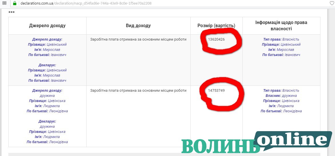 Старший державний інспектор Державної фіскальної служби у Волинській області Мирослав Цивінський та його дружина Людмила Цивінська задекларували понад 28 мільйонів гривень зарплати.