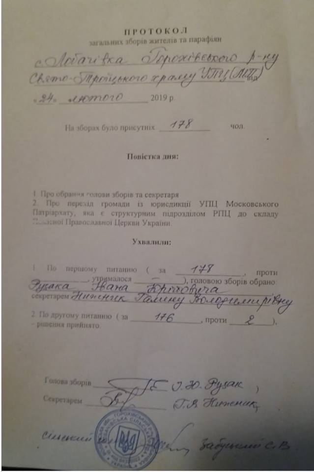 Речник Волинської єпархії УПЦ МП Олег Точинський висловив сумніви щодо законності переходу громади у селі Лобачівка до Православної Церкви України через печатку та підпис голови сільради Святослава Забузького на протоколі зборів.