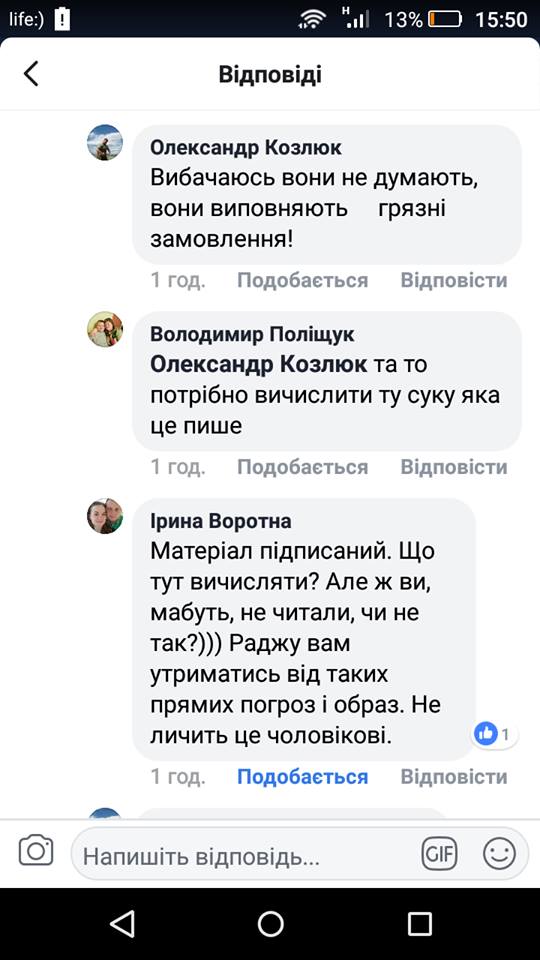 Учора, 10 лютого, після громадських обговорень у селі Підгірне, я побачила у “Facebook” коментарі від Володимира Поліщука. Чоловік написав, що “треба вичислити ту суку яка це пише”. Щоб з’ясувати, що саме так зачепило чоловіка і для чого мене вичисляти, я вирішила сама приїхати до нього. Я знала його дружину і вважала, що можемо з’ясувати все цивілізовано. Однак я помилилась. Герой вживу нічим не відрізнявся від фейсбучного. Кричав, хамив і накінець вийняв телефон і почав мене фоткати. До слова, швагро цього невігласа очолює Держпродспоживслужбу в районі, де якраз і будується норкова ферма”, – розповідає у дописі журналістка.