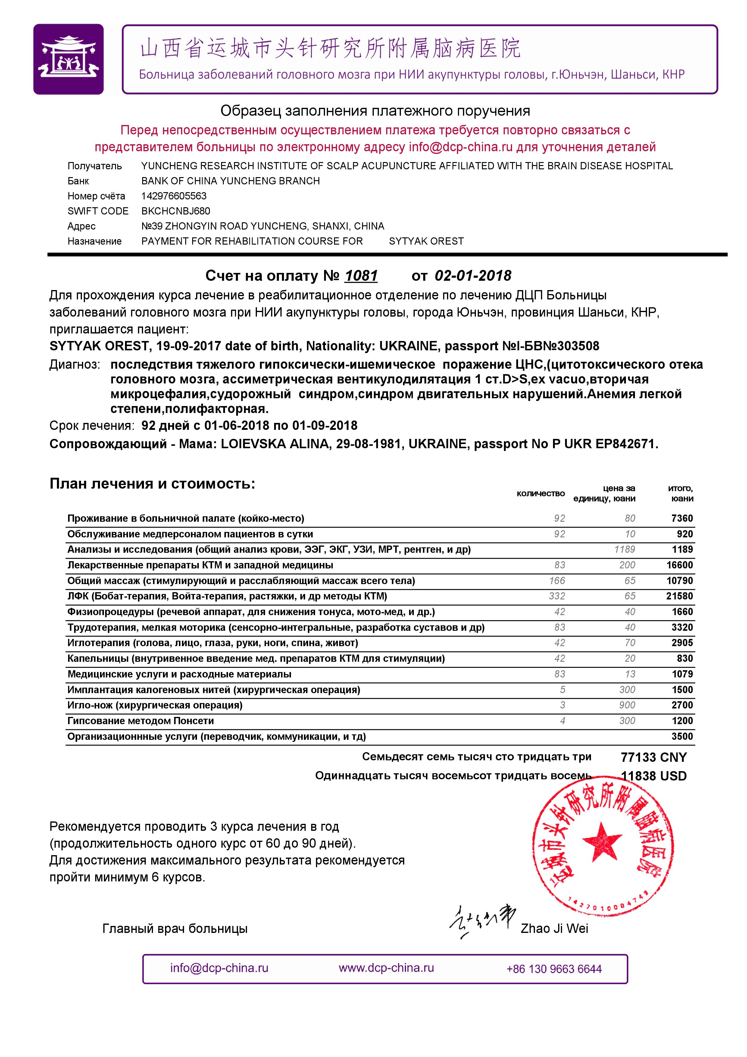 Фахівці німецької клініки у Дортмунді дали невтішні прогнози на лікування Ореста, проте китайські фахівці все ж говорять про можливість успішного результату. Однак є перешкода – вартість лікування і реабілітації. Це непосильна для батьків та родичів сума – 71028 доларів. Один курс коштує понад 11 тисяч доларів, загалом потрібно пройти 6 курсів. Ці кошти потрібні, щоб дати шанс дитині розвиватися, вчитися рухатися та ковтати їжу.