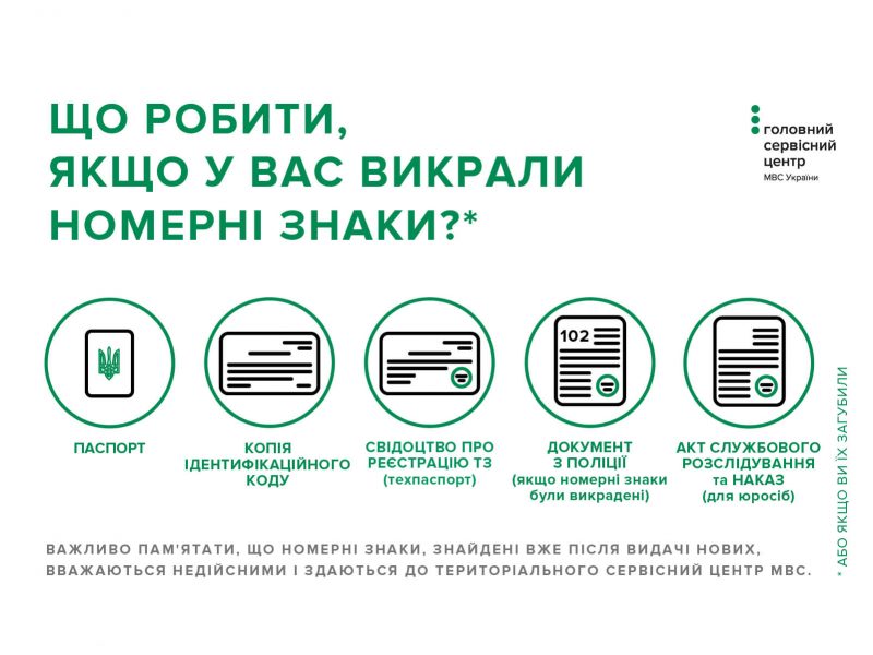 У разі викрадення або втрати власником транспортного засобу номерних знаків працівники сервісного центру МВС проводять перереєстрацію цього транспортного засобу.