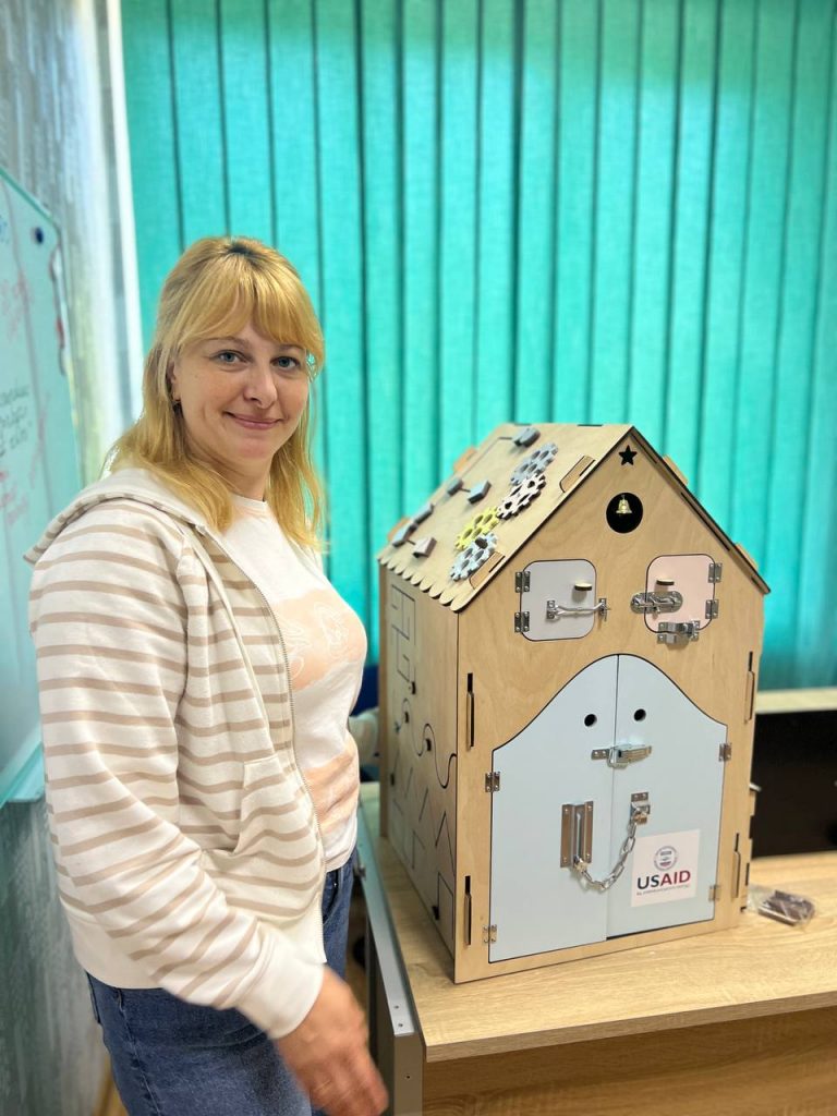 Інклюзивно-ресурсний центр “Жовта парасоля”, де проходять корекційні заняття 70 дітей з інвалідністю з Володимир-Волинської та сусідніх громад, отримав подарунок від проєкту USAID “ГОВЕРЛА” у співпраці з ГО “ФУНДАЦІЯ”ПРОСТІР” – розвиваючу іграшку бізібудинок.